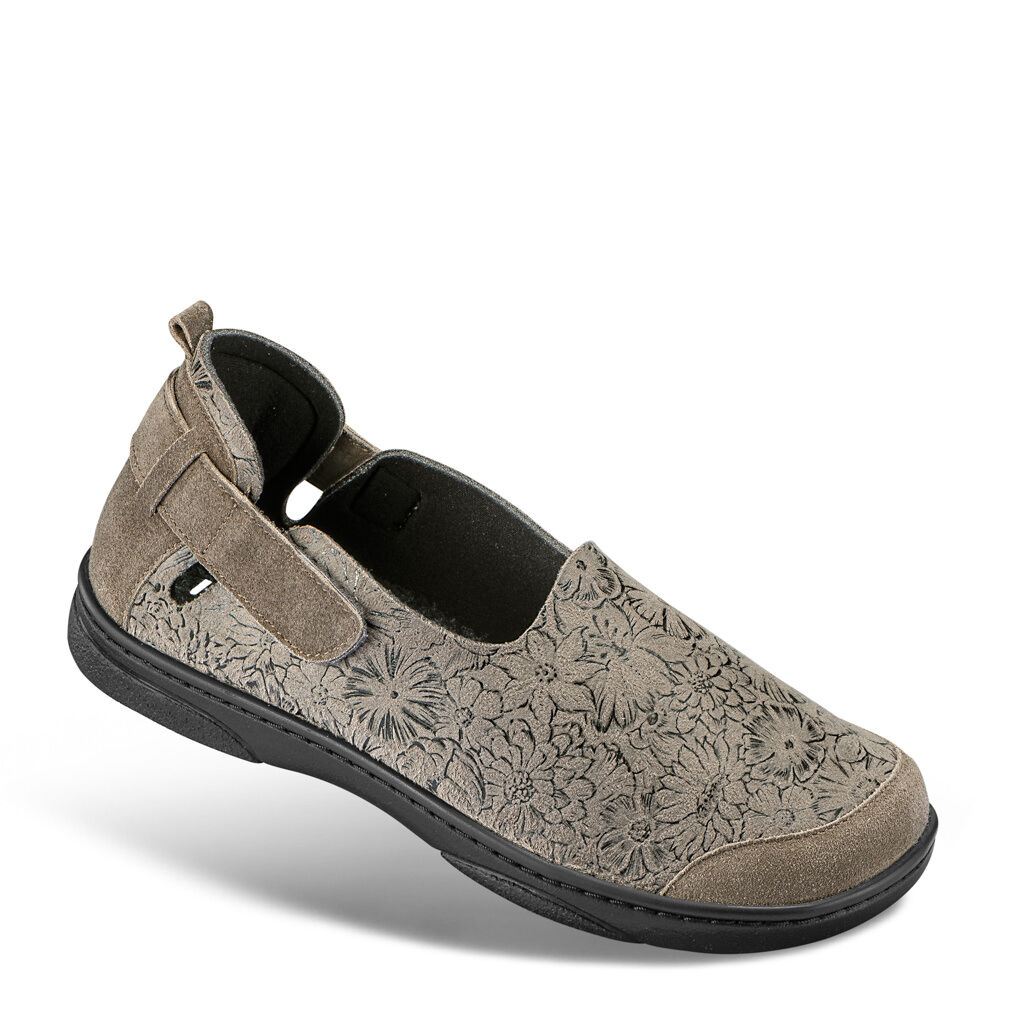 Doppelt sanft zu den Füßen: aus gepolstertem, elastischem Textil mit Lederkappen und mit Extra-Weite durch den Klettverschluss an der Ferse, rutschfest geführt durch Gürtelschlaufen. Ultraleichte Schalen-Sohle mit austauschbarem Polsterfußbett.