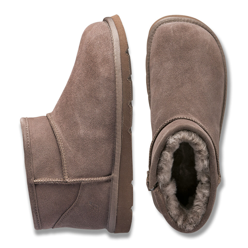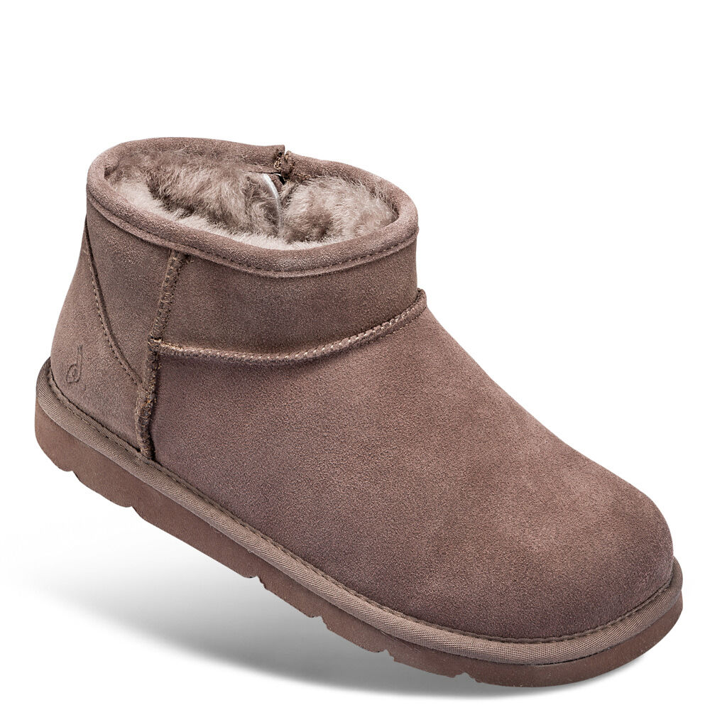 Unempfindlicher, weicher Bootie aus Veloursleder. Mit Reißverschluss, warmen Lammfellfutter und -einlegesohle. Extra flexibel durch Strobel-Machart. Gekerbte, griffige Sohle für drinnen und draußen.