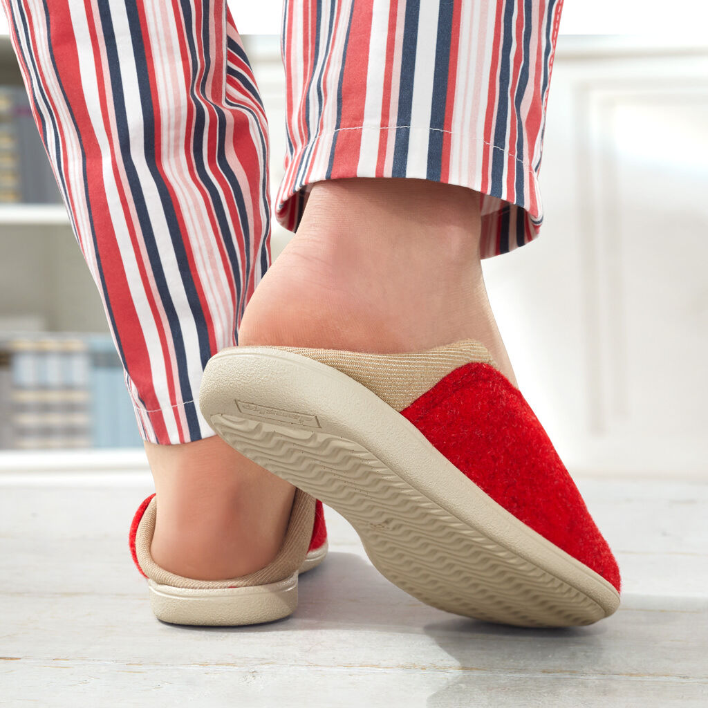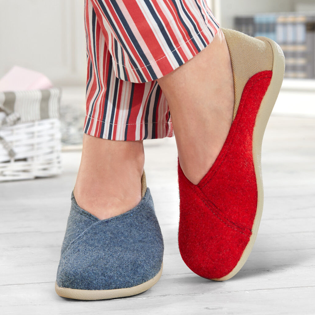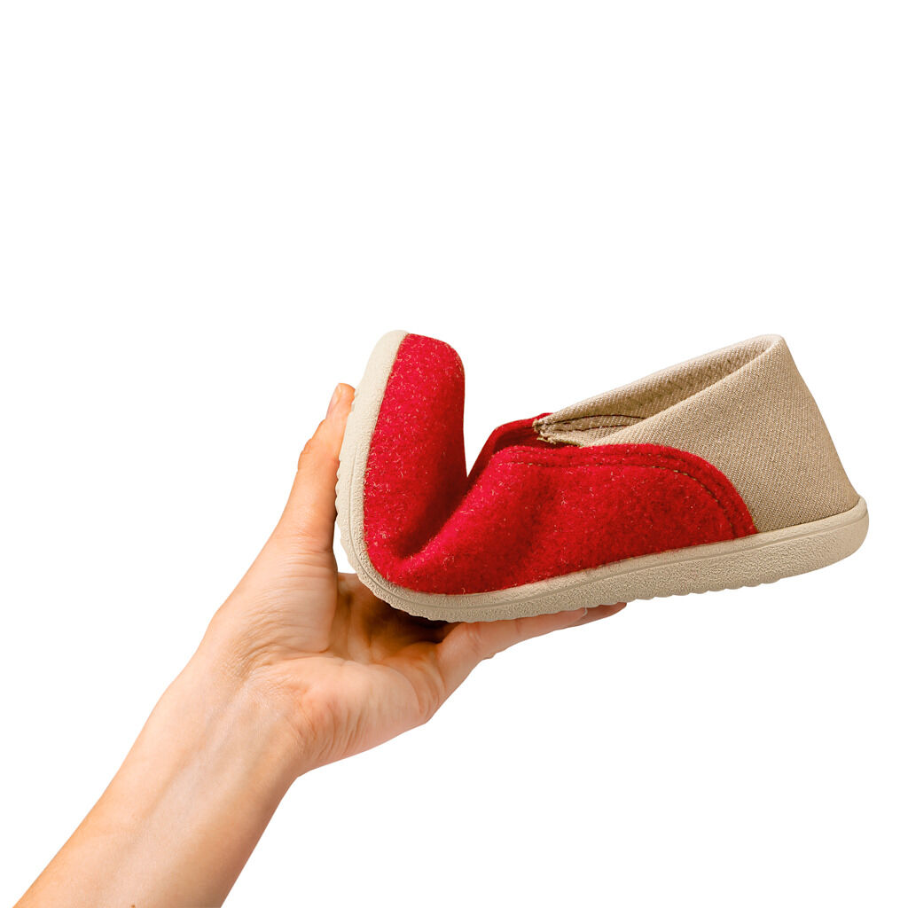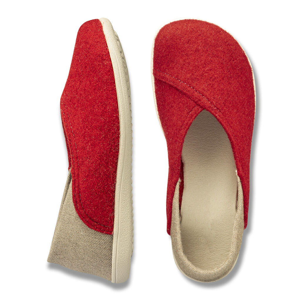 Geformt wie barfuß, beweglich wie barfuß und barfuß getragen ein besonderes Erlebnis. Hausschuh aus Wollfilz, atmungsaktiv und warm, mit selbstformender Ferse aus Stretchmaterial für den perfekten Sitz. Eine dünne, flexible Leicht-Sohle mit schaumgepolstertem Fußbett.