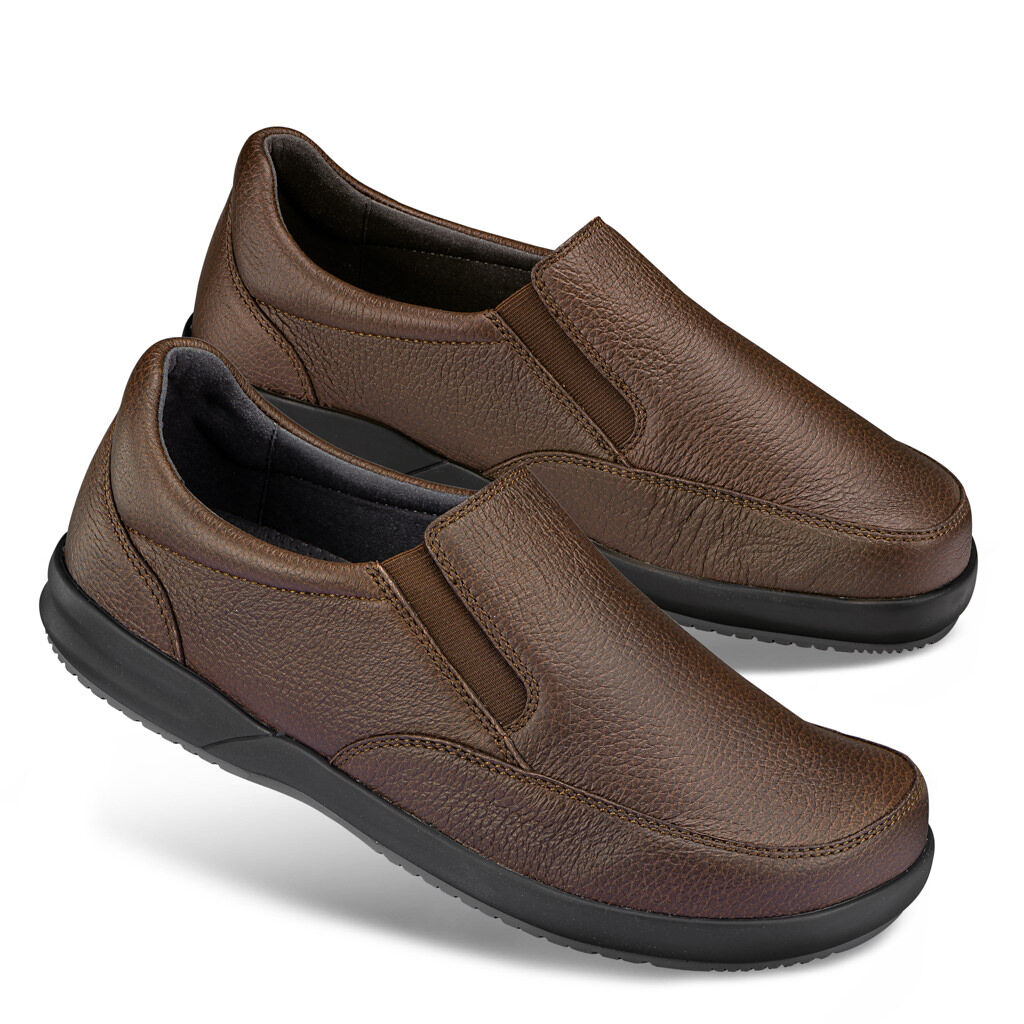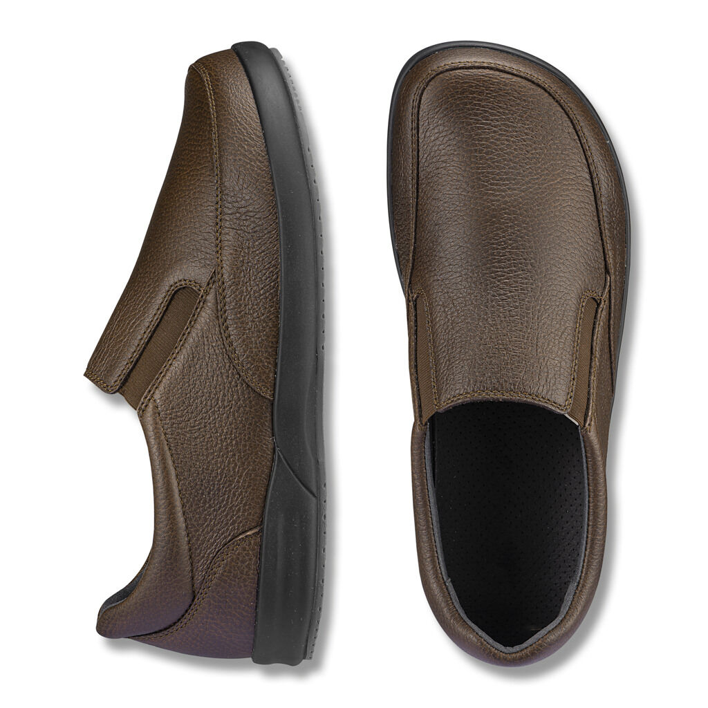 Vielseitig zu Jeans und Anzug. Dreifach flexibel durch Strobel-Verarbeitung, weiches Elchleder und seitliche Gummizüge. Innen Futter aus hautfreundlicher Mikrofaser und ein gegen eigene Einlagen austauschbares Fußbett. Natürlich geformte Grip-Tec-Sohle mit Dämpfungsschicht und rutschminderndem Gummiprofil.