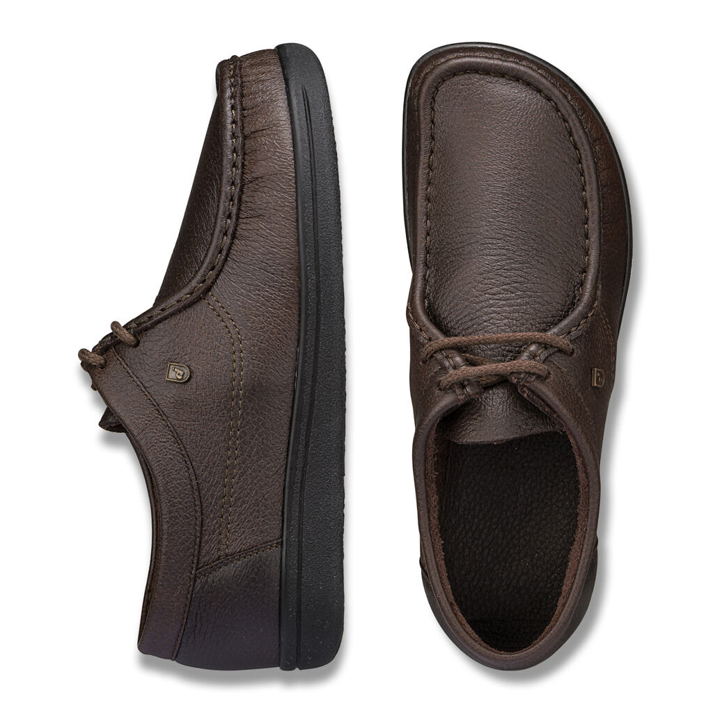 Der handgenähte Mokassin ist der pure Genuss von den Zehenspitzen bis in den Rücken. Die hohe Schnürung sitzt druckfrei auch am höheren Rist. Vollkommen wird das Wohlgefühl durch das weiche Elchleder. Für besondere Atmungsaktivität wird es ungefüttert verarbeitet. Dämpfende Sohle in Null-Linie, mit selbstformendem Fußbett.
