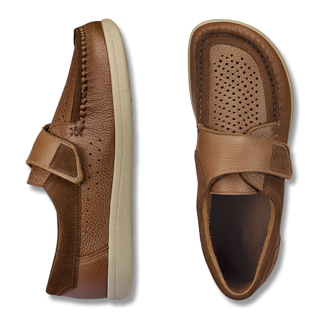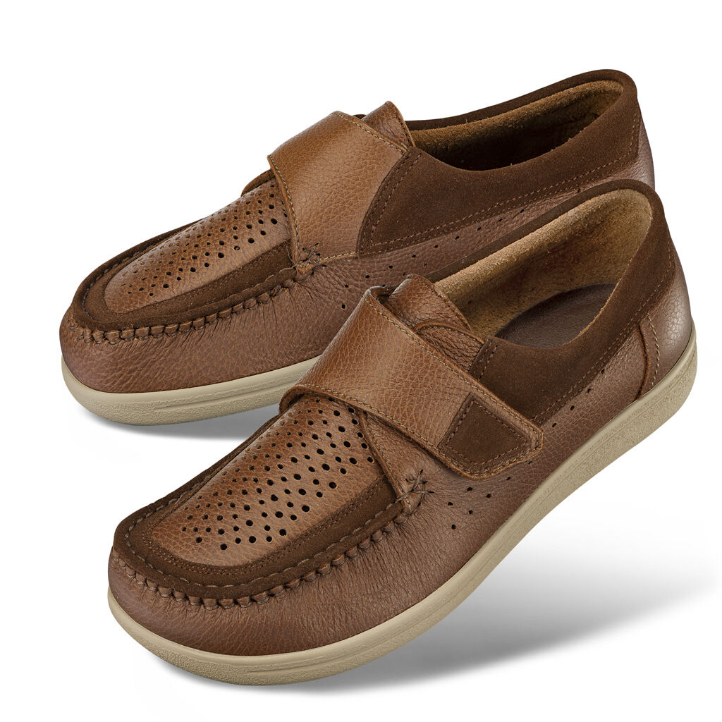 Handgenäht aus butterweichem Elchleder, mit Lochmuster fürs frische Klima und Klettband für druckfreie Passform: Das ist der ultimative Sommer-Mokassin, in der einzigartigen Bequemform. Die dämpfende Sohle hat ein selbstformendes Filzfußbett.