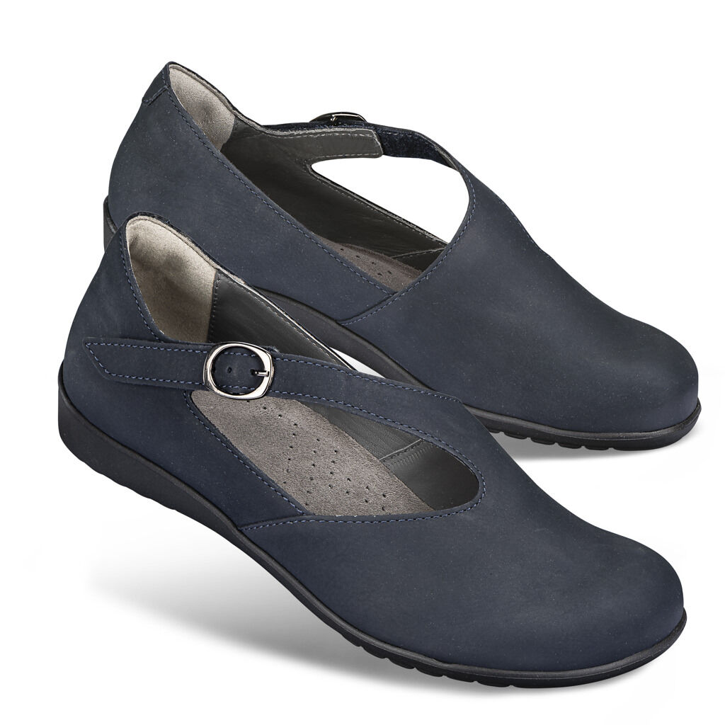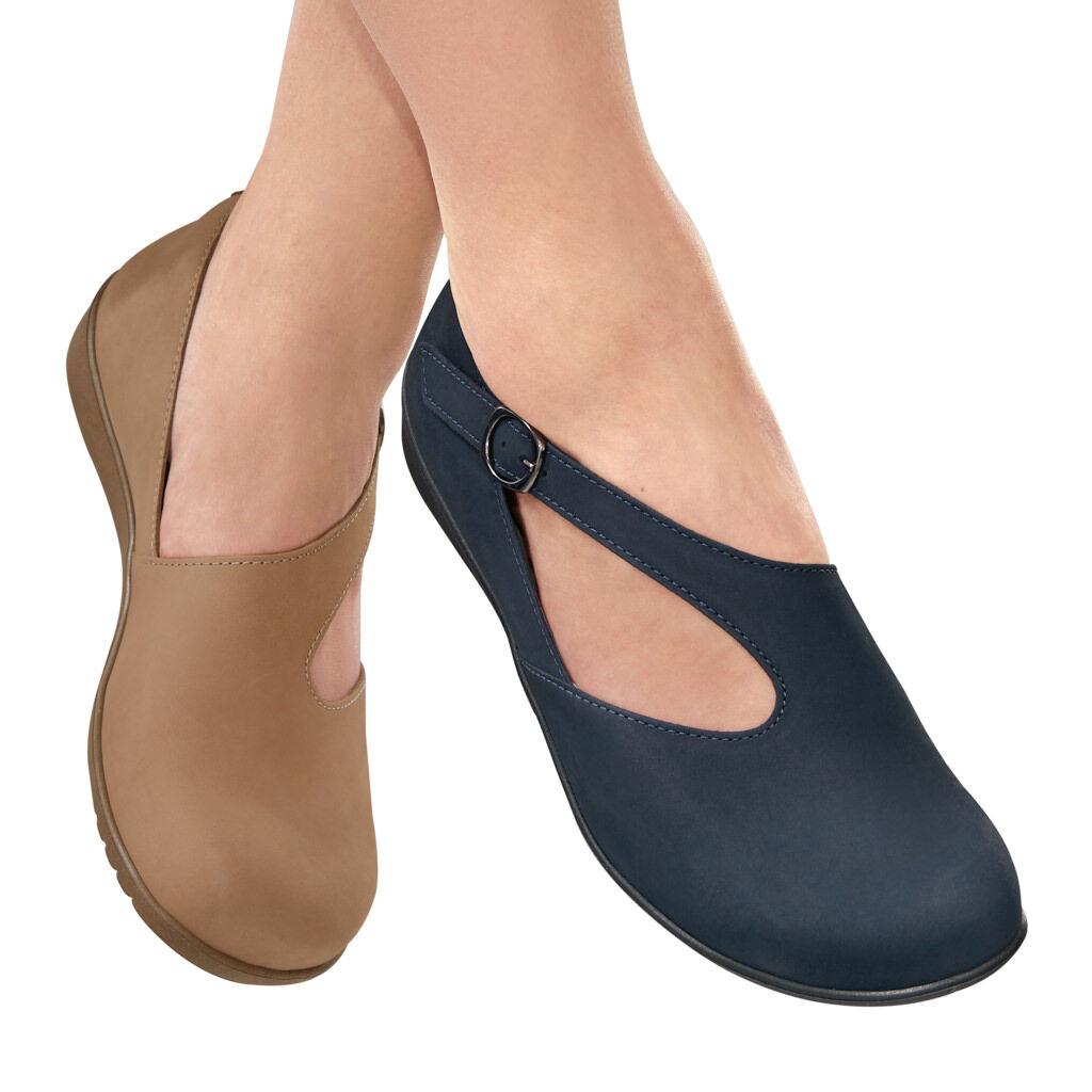 Diese edle und bequeme Leder- Ballerina ist ein echter Fußschmeichler und passt mit oder ohne Strümpfe perfekt zu klassischer sowie eleganter Damenmode. Das schöne Design wird geprägt durch das streckende, diagonale Klettband mit kleiner Zierschnalle und das samtig matte Nubukleder, fast komplett ohne Nähte. Innen mit Lederfutter. Feminine, federnde Weichtritt- Sohle.