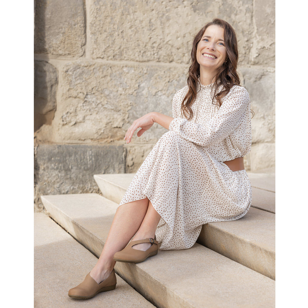 Diese edle und bequeme Leder- Ballerina ist ein echter Fußschmeichler und passt mit oder ohne Strümpfe perfekt zu klassischer sowie eleganter Damenmode. Das schöne Design wird geprägt durch das streckende, diagonale Klettband mit kleiner Zierschnalle und das samtig matte Nubukleder, fast komplett ohne Nähte. Innen mit Lederfutter. Feminine, federnde Weichtritt- Sohle.