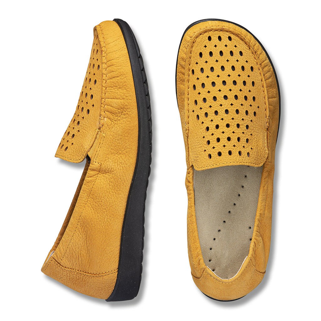 Handgenäht aus Nubukleder, ein luftiges Federgewicht mit tollem Innenleben: Das Lochmuster wird durch ein hautfreundliches Lederfutter stabilisiert. Mit kleinen seitlichen Dehneinsätzen. Weichtritt- Sohle mit lederbezogenem Wechselfußbett.