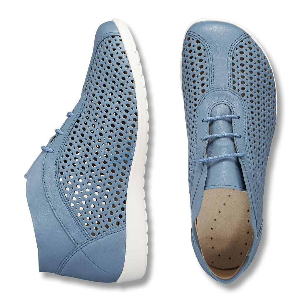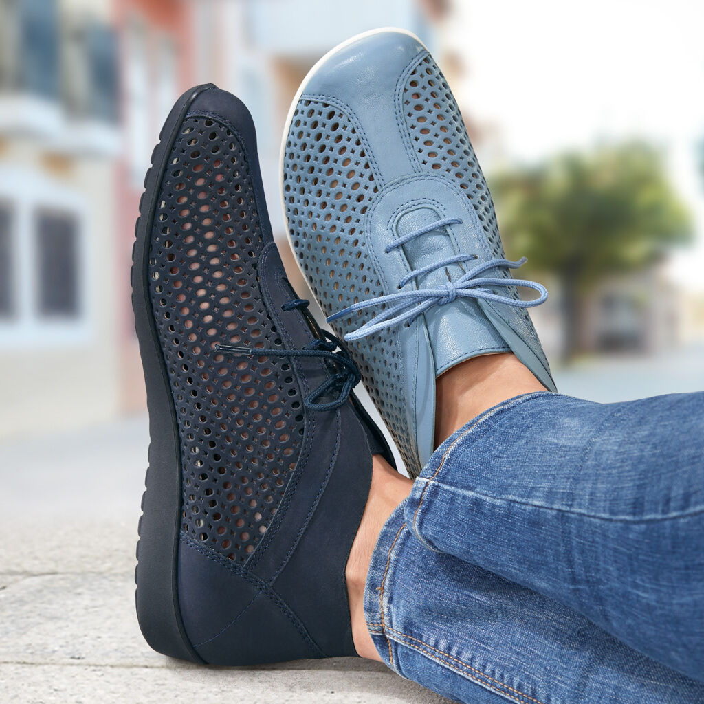 Durch die Verarbeitung von perforierten oder gelochten Ledern sowie von luftdurchlässigen Textilien gewährleisten wir eine hohe Atmungsaktivität unserer Sommerschuhe. Auf diese Weise kann der Schweiß abtransportiert werden und die Außenluft gelangt in den Schuh. Dadurch kann der Fuß atmen.