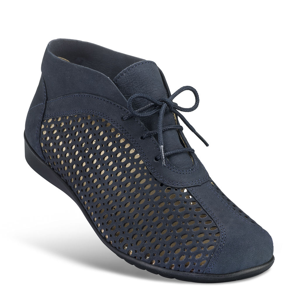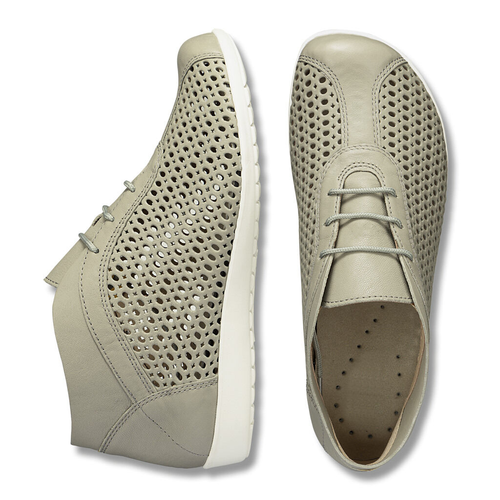 Durch die Verarbeitung von perforierten oder gelochten Ledern sowie von luftdurchlässigen Textilien gewährleisten wir eine hohe Atmungsaktivität unserer Sommerschuhe. Auf diese Weise kann der Schweiß abtransportiert werden und die Außenluft gelangt in den Schuh. Dadurch kann der Fuß atmen.