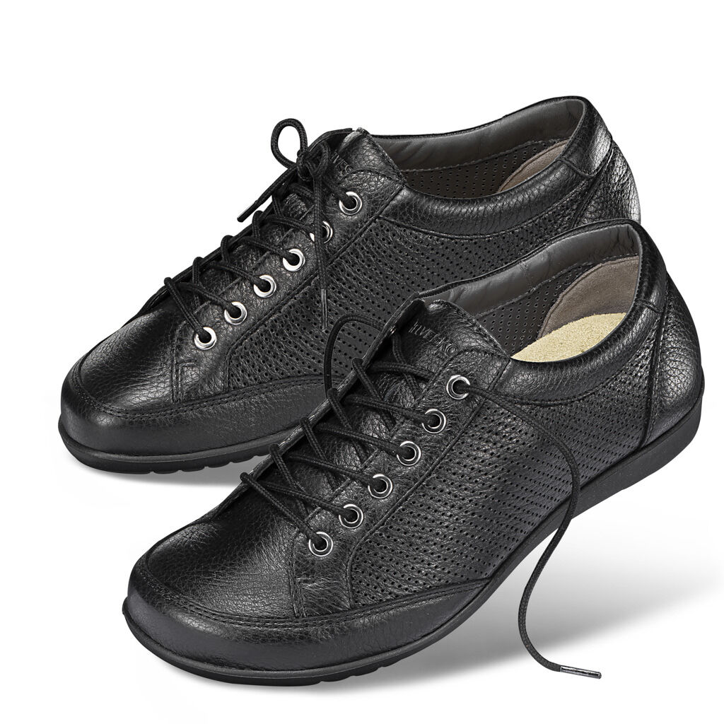 Durch die Verarbeitung von perforierten oder gelochten Ledern sowie von luftdurchlässigen Textilien gewährleisten wir eine hohe Atmungsaktivität unserer Sommerschuhe. Auf diese Weise kann der Schweiß abtransportiert werden und die Außenluft gelangt in den Schuh. Dadurch kann der Fuß atmen.