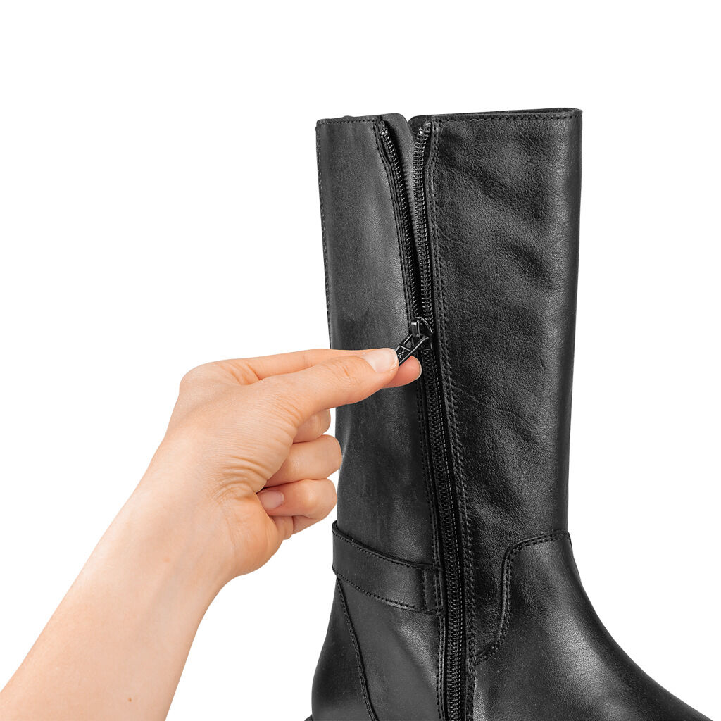 Wichtig ist, dass der Fuß in der Ferse und am Rist guten Halt hat, jedoch für die Zehen viel Platz vorhanden ist. Beim Anziehen drücken Sie Ihren Fuß fest in die Ferse zurück und schließen die Schnürung, das Klettband oder den Reißverschluss. Dann haben Sie einen sicheren Halt in Ferse und Rist. Somit haben Ihre Zehen genügend Platz zum Spreizen und Abrollen.