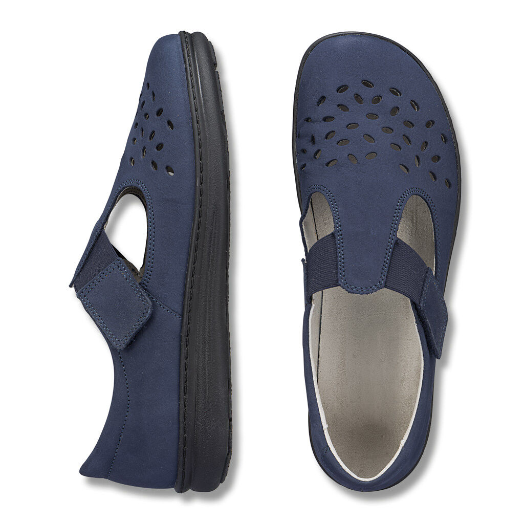Fast so luftig wie eine Sandale, mit dem Halt eines Halbschuhs und idealem Sitz durch Klett und Elastik! Hübscher Barfußschuh aus Leder mit Lochmuster und Randpolstern. Zwei breite Gummizüge für den flexiblen Sitz am Rist. Futter aus barfußfreundlicher Mikrofaser. Federnde Leicht-Sohle mit austauschbarem Fußbett.