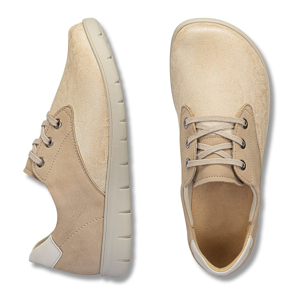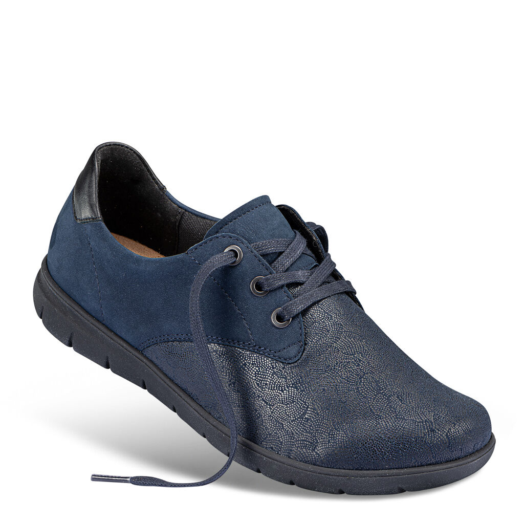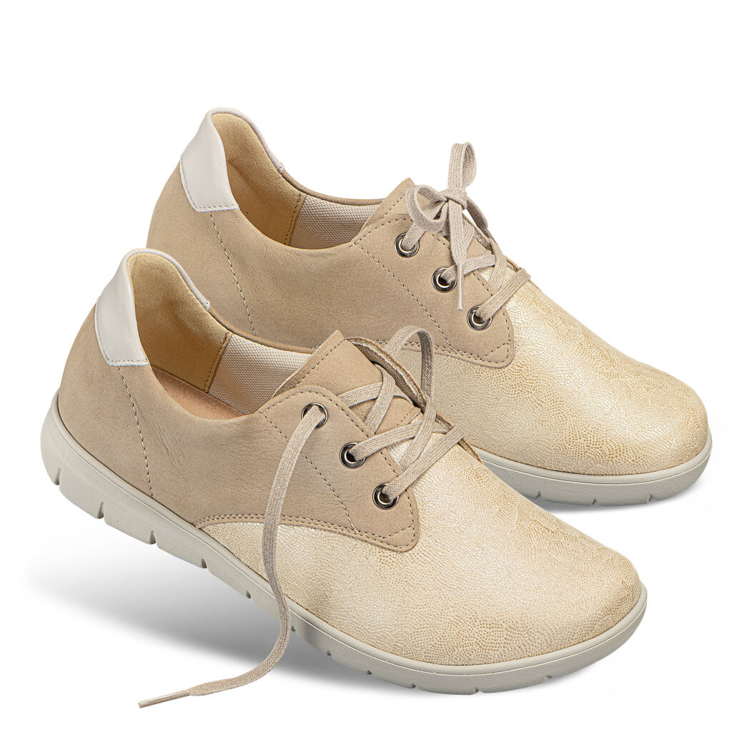 Halbschuh in flexibler Lederkombination, Ton in Ton. Mit kurzer Derby-Schnürung, nahtfreiem Vorderfuß und sanftem Mikrofaserfutter für ein angenehmes Fußklima. Auf der extra bequemen Infinity-Sohle mit einem Fußbett aus Naturkork, auswechselbar gegen eigene Einlagen.