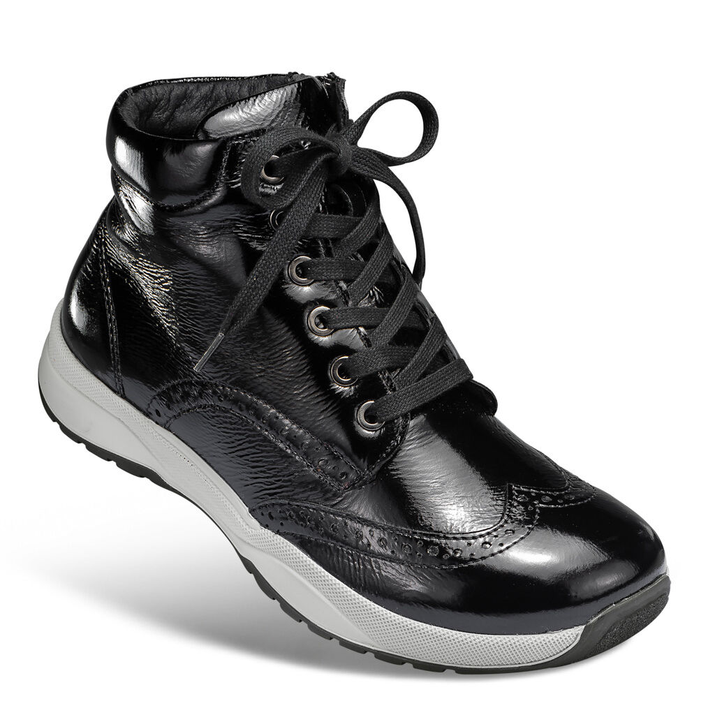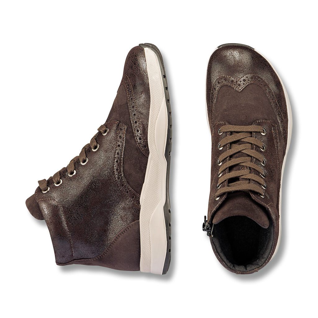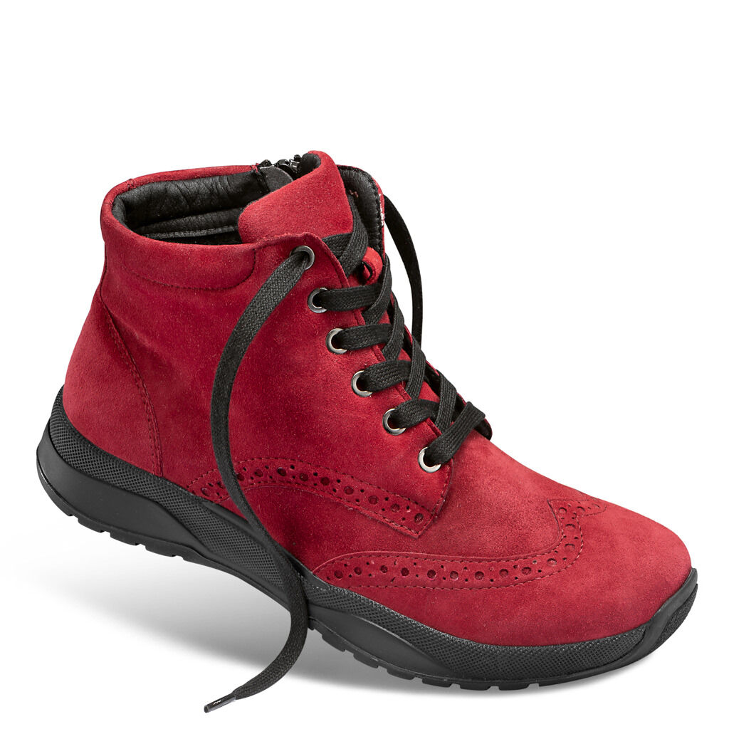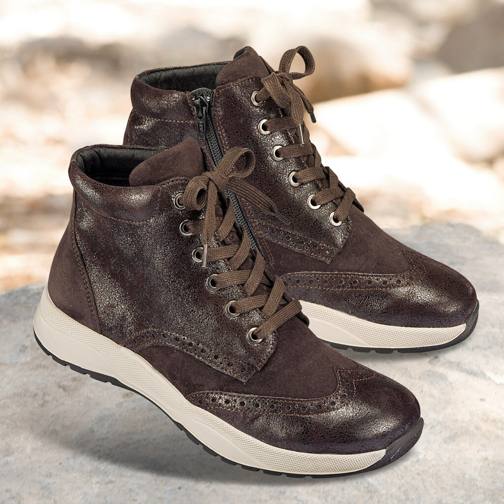Bequeme Leder-Stiefelette auf der flexiblen Soft-Move-Sohle mit einer weit zu öffnenden Derby-Schnürung, seitlichem Reißverschluss und Polstern an Zunge und Rand. In flexibler Strobel-Machart mit eleganten Lochbordüren im Budapester Stil. Innen Lodenfutter, auch als Decksohle beim Wechselfußbett.