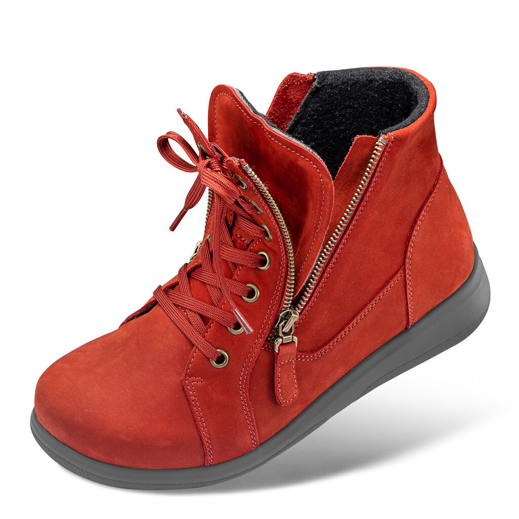 Extrabreiter Bootie in robuster Winter-Qualität: unempfindliches Nubukleder, gefüttert mit Walkloden, durch TEX-Ausstattung wasserdicht und atmungsaktiv. Mit weichen Polstern, Reißverschlüssen zum Aufklappen und einem auswechselbaren, warmen Fußbett. Druckentlastende, bequeme Sensitiv-Sohle.