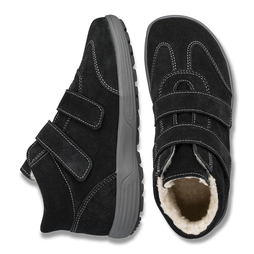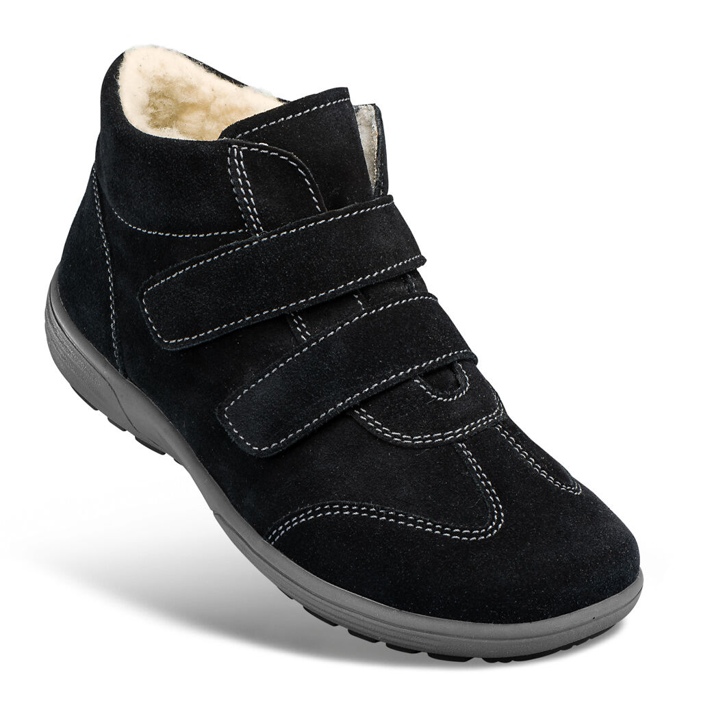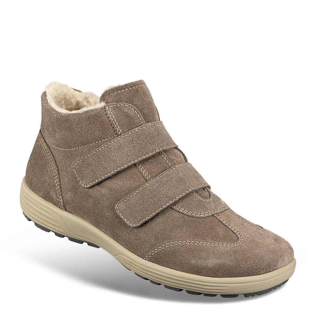 Rundum bequeme Stiefelette in nachgiebiger Strobel-Machart. Zwei Klettbänder und der breite Polsterrand geben sicheren Halt. Hydrophobiertes Veloursleder mit flauschigem Teddyfutter und flexible Super- Soft-Sohle mit einem gegen eigene Einlagen austauschbarem Fußbett.