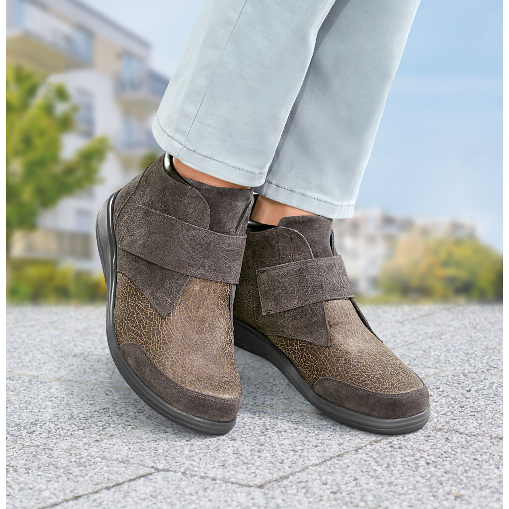 Wichtig ist, dass der Fuß in der Ferse und am Rist guten Halt hat, jedoch für die Zehen viel Platz vorhanden ist. Beim Anziehen drücken Sie Ihren Fuß fest in die Ferse zurück und schließen die Schnürung, das Klettband oder den Reißverschluss. Dann haben Sie einen sicheren Halt in Ferse und Rist. Somit haben Ihre Zehen genügend Platz zum Spreizen und Abrollen.