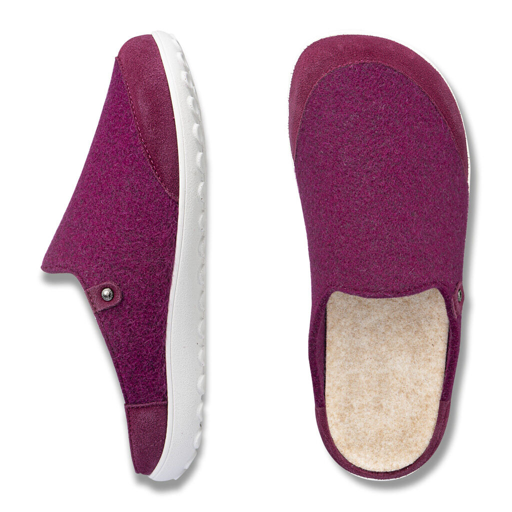 Flexibel abrollende Wollfilz-Pantoffel auf der griffigen Free-Style- Sohle. Weich und luftig am Fuß, formstabil durch Lederkappen. Warm bezogenes und austauschbares Fußbett, umweltschonend hergestellt.