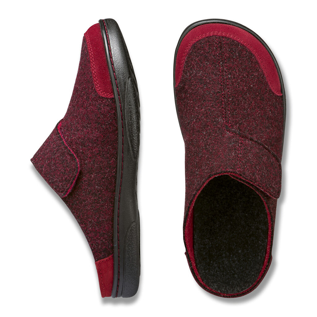 Herrlich leicht und doch robust! Atmungsaktiver Wollfilzpantoffel, doppellagig gearbeitet für hohe Formstabilität und schöne Farb-Effekte. Mit farblich abgestimmten Lederkappen als Stoßschutz. Flexibel durch Opanken-Machart, weit zu öffnen und ideal anpassbar mit Klett. Das warme Fußbett ist auswechselbar, die dämpfende Schalen-Sohle ist federleicht.