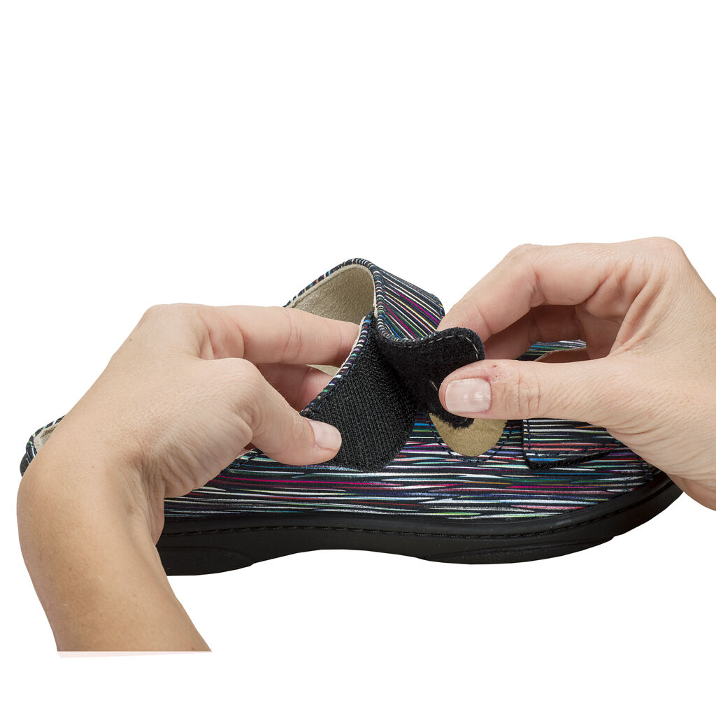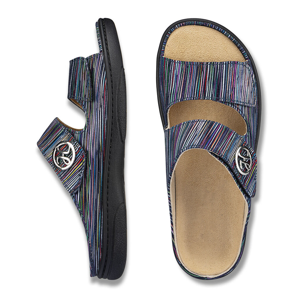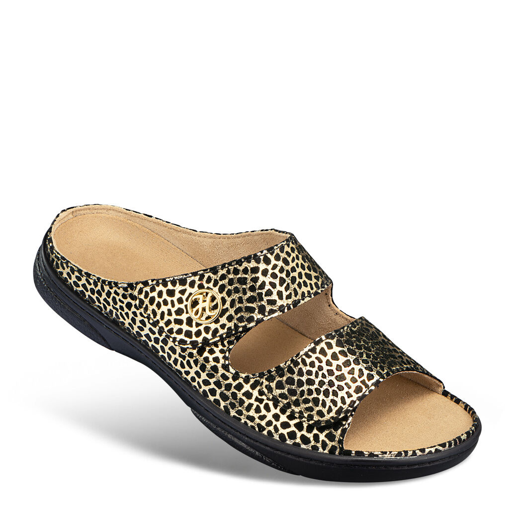 Mit zwei Klett-Riemen ist die luxuröse Leichtpantolette im Nu wie nach Maß anpassbar. Das funkelnde Detail am Klettverschluss verleiht dem Schuh eine elegante Note. Ein echter Hingucker für stilvolle Sommer-Auftritte! Das Oberleder und die federleichte Schalen- Sohle sind flexibel mit einer Opanken-Naht verbunden. Weiches Ziegenlederfutter und Wechselfußbett mit Mikrofaser-Bezug.