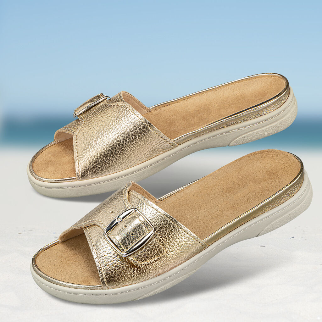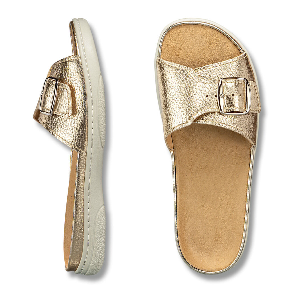 Die Einlegesohle war einfach durch die orthopädischen ersetzbar, das Design ist angenehm schlank gehalten. Endlich keine plumpen, klobigen Pantoffel, wie ich sie sonst beim Orthopädiefachgeschäft aufgrund meines breiten Ristes nehmen musste. Ich bin begeistert.