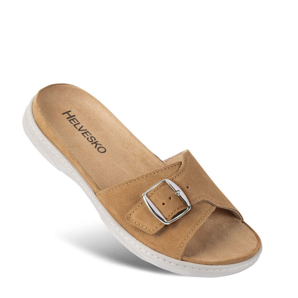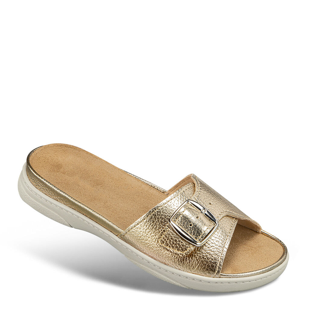 Sehr bequemer Hausschuh, der auch als Sommersandale getragen werden kann. Innen und außen mit Leder gearbeitet. Die Innensohle ist weich, das Veloursleder angenehm, auch barfuß zu tragen. Obwohl nur eine breite, verstellbare Schnalle zur Verfügung steht, hat man perfekten Halt. Mein Modell ist beige mit beiger Innensohle und passt auch als Hausschuh meist zu meinem Outfit.