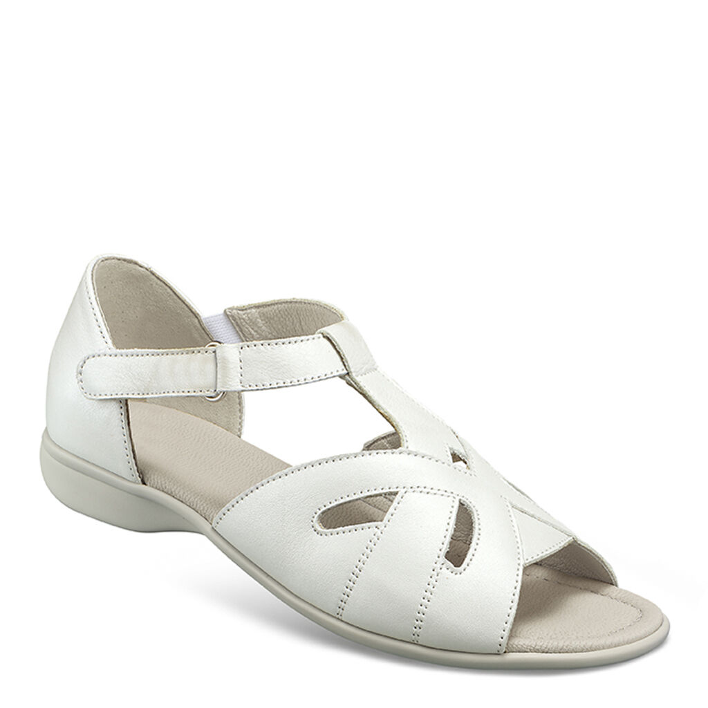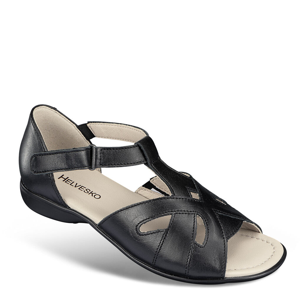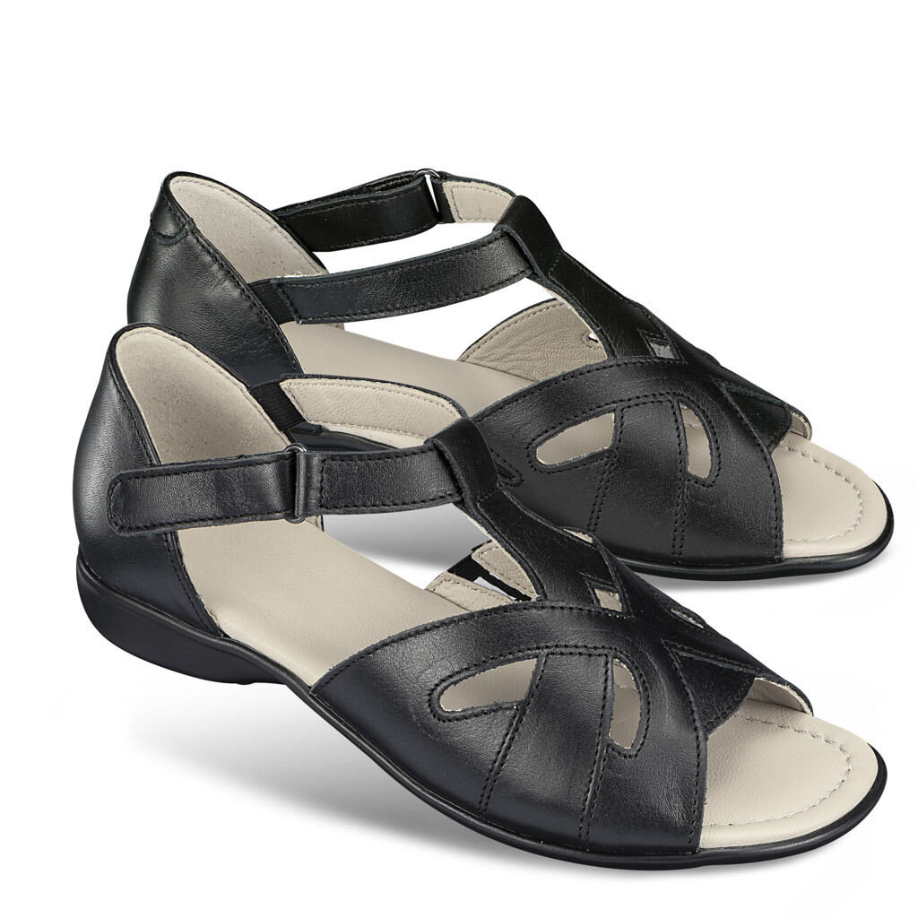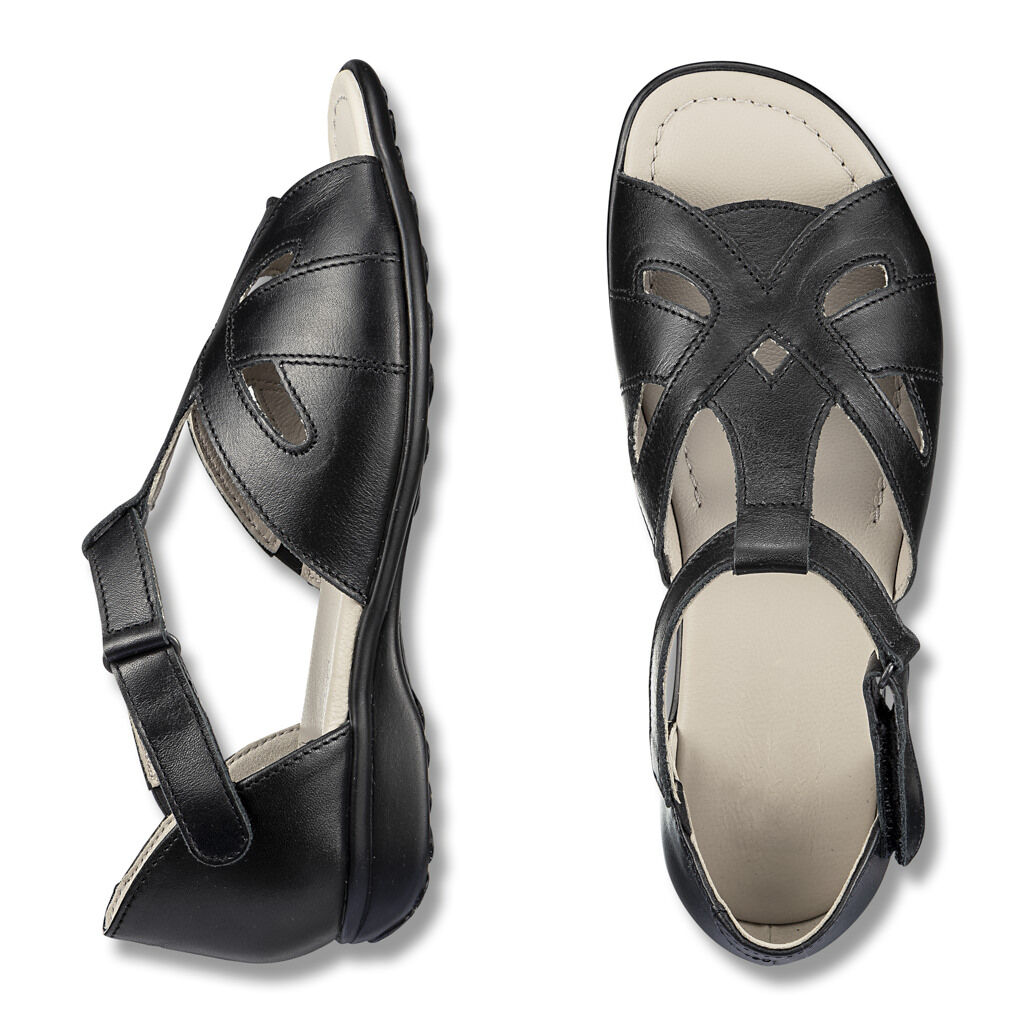 Luftig an Zehen und Lochmuster, aber hinten geschlossen: So gibt die feine Sandale idealen Halt und verdeckt vorteilhaft die Ferse. Ein exklusives Modell des Lederhandwerks, wunderbar für empfindliche Füße. Geschmeidiges Nappaleder mit Lederfutter und Dehnzonen, schlank in der Optik durch die T-Spange mit Klettverschluss. Sandalen-Sohle mit lederbezogenem Polsterfußbett.