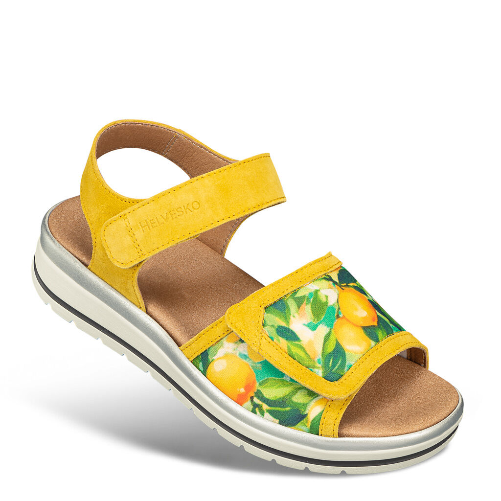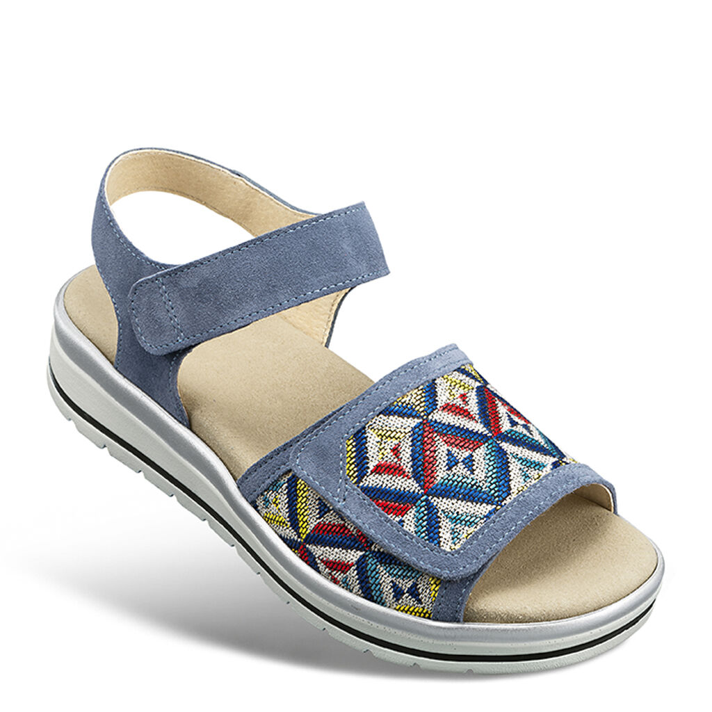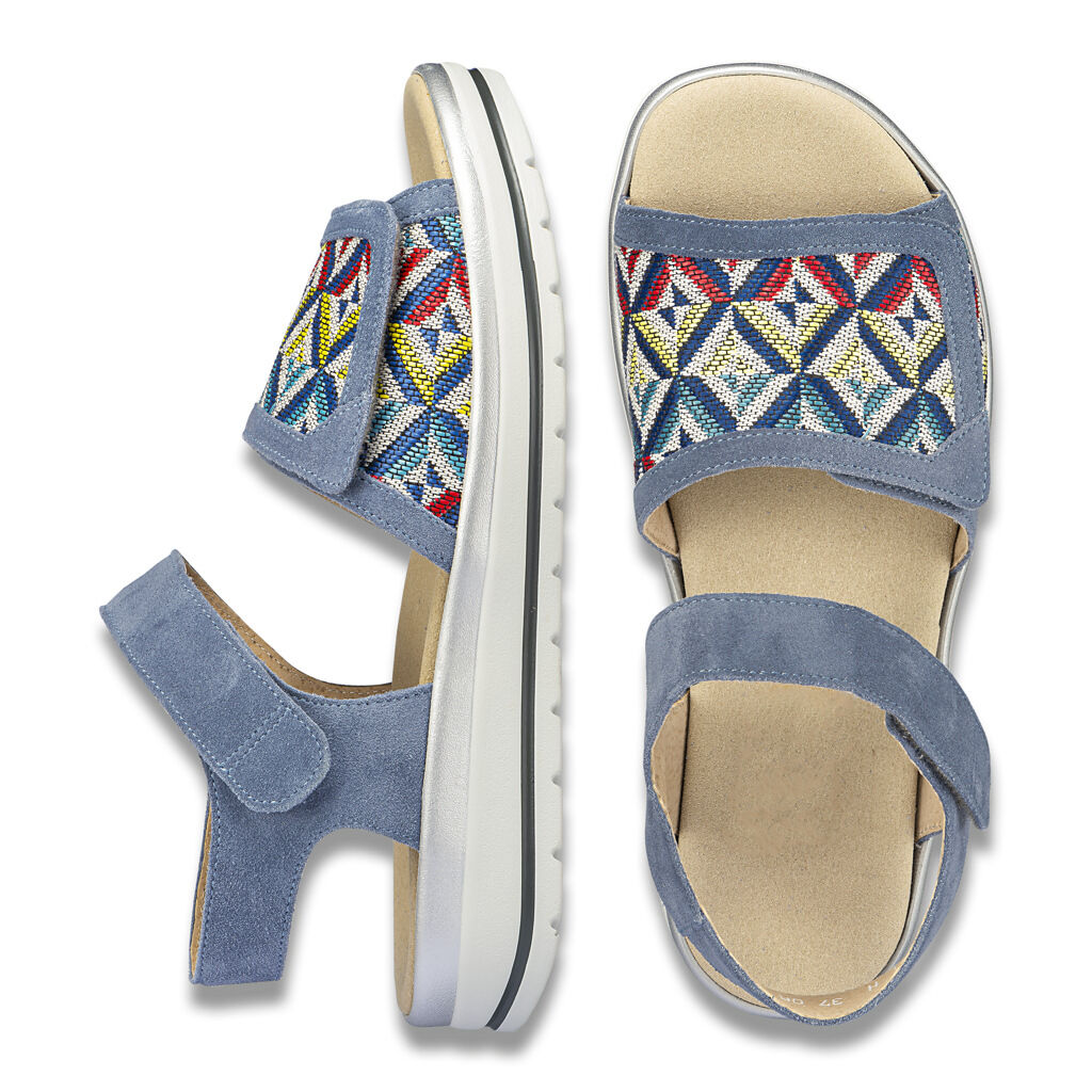 Bequemsandale als bildschöne Sommerfreundin. Das Schmuckband mit dem Gobelin-Einsatz, die Lederfarben und die leichte, weich dämpfende Sommer-Style-Sohle bilden zusammen eine perfekte Harmonie. Mit Klettverschlüssen für den stabilen Halt, aus samtigem Veloursleder mit Lederfutter und austauschbarem Fußbett.