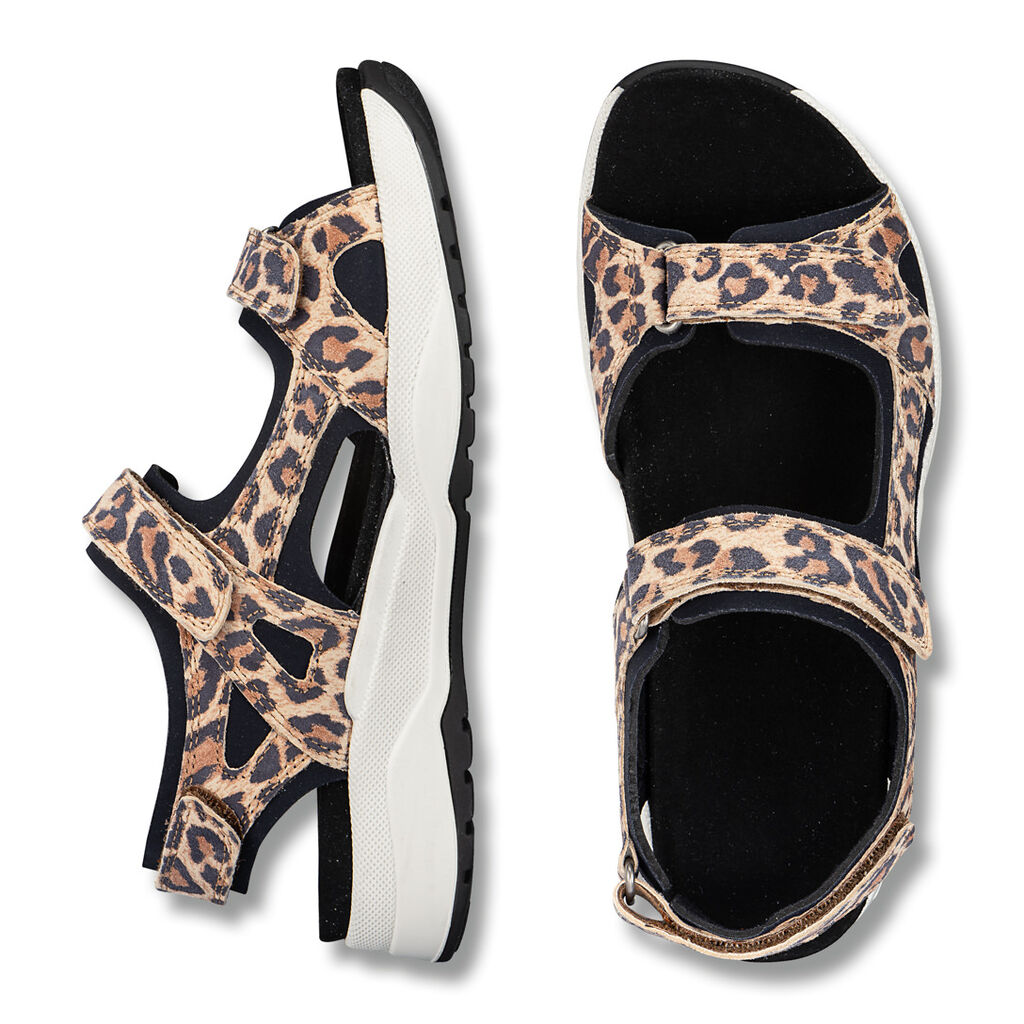 Federnd und flexibel am ganzen Fuß - eine junge Sandale aus hochwertigem Leder mit weichem Neopren als Futter und Randpolster, perfekt anpassbar  durch drei Klettbänder. Rückfedernde Soft- Move-Sohle mit austauschbarem Leichtkork-Fußbett.
