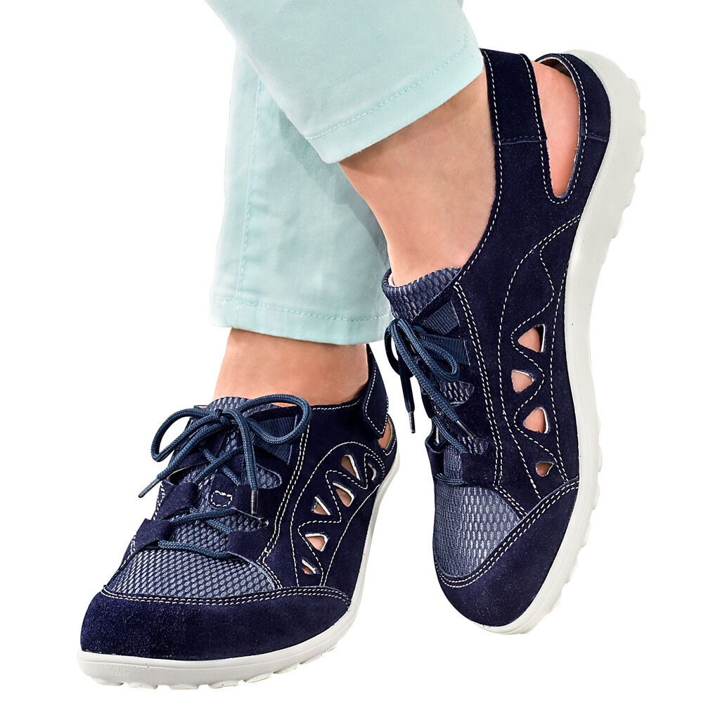 Dieser hochflexible Sandalenschuh ist ein sportliches Leichtgewicht, ringsum luftig aus Veloursleder mit Mesh-Einsätzen und Lochmuster. Variabler Sitz durch die Schnürung über dem weichen Zungenpolster und das Fersen-Klettband. Futter aus hautfreundlicher Mikrofaser. Elastische Free-Style-Sohle mit austauschbarem Fußbett.