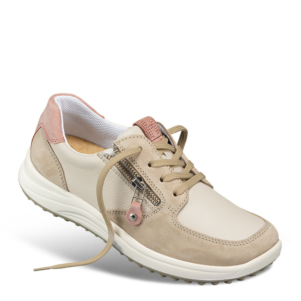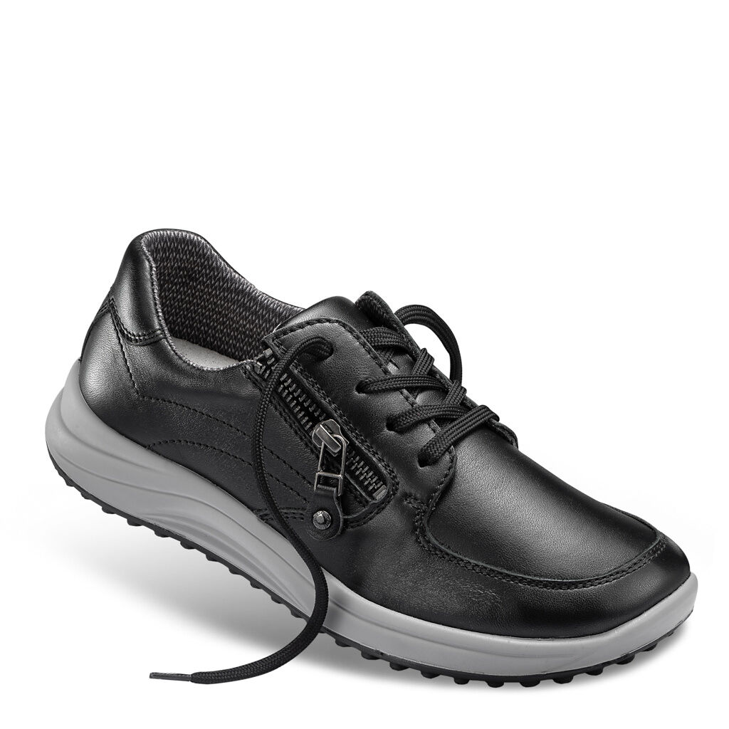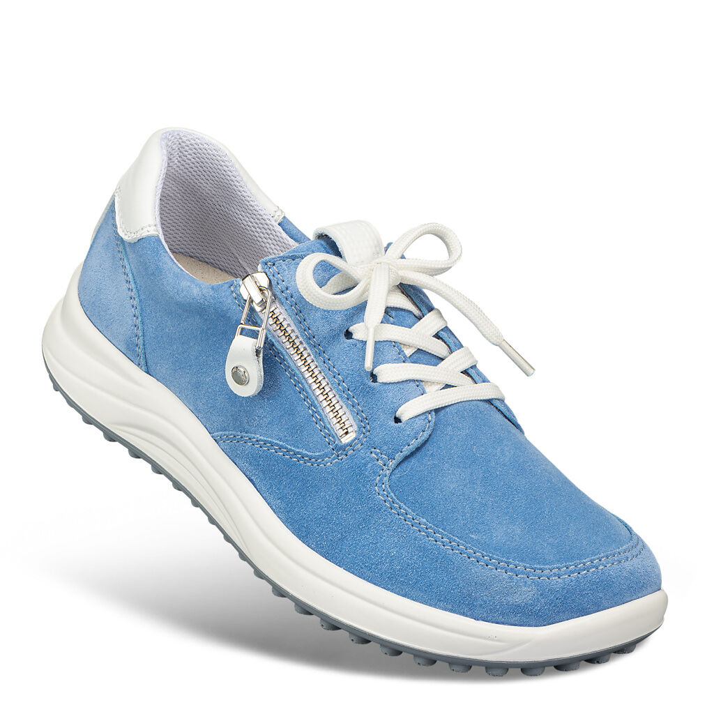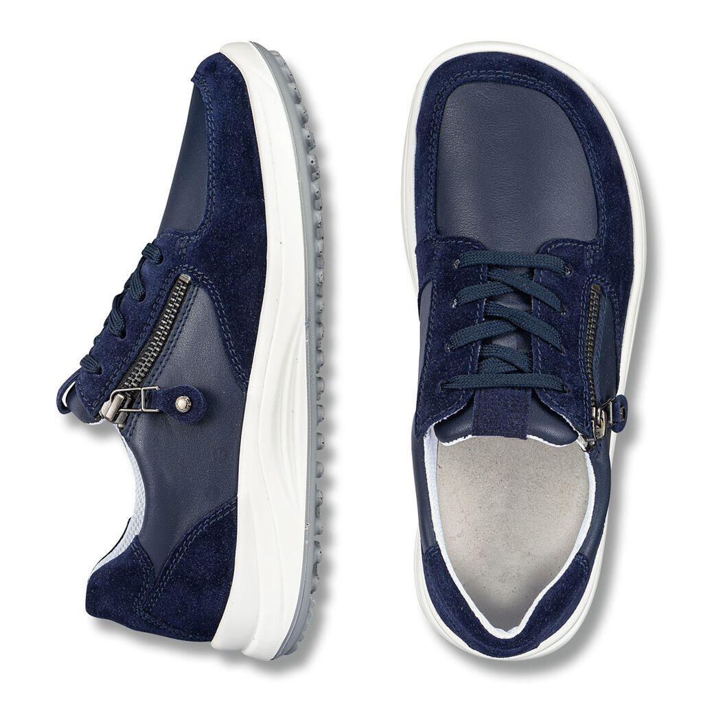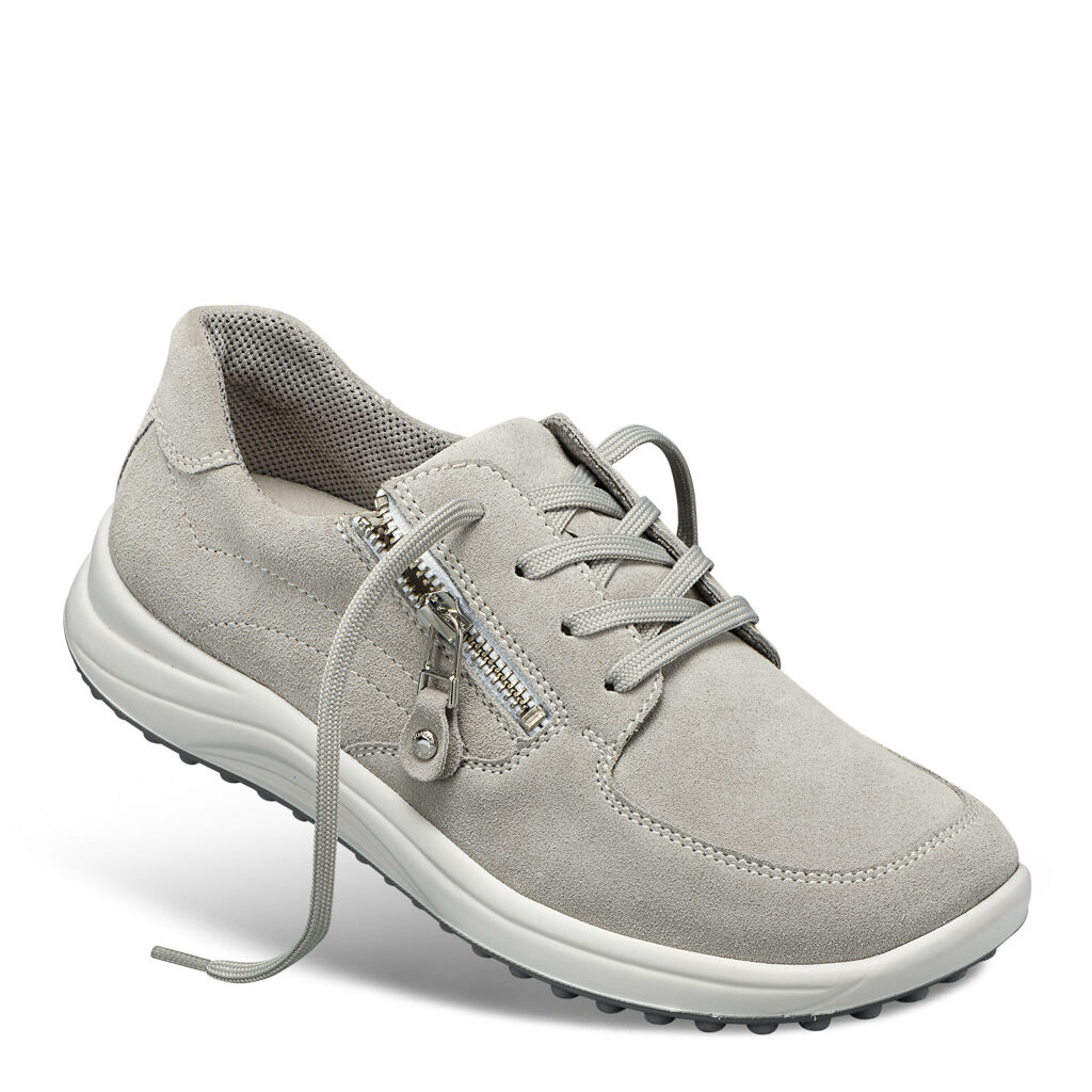 Das Geheimnis des wunderbar bequemen Sneakers liegt in der Extra-Flex-Sohle: Durch die Konstruktion mit Stretch gibt sie beim Auftritt zu den Seiten nach, damit sich der Fuß ausbreiten kann. Ein Verwöhnmodell aus weichem Veloursleder mit Polstern, Schnürung plus Reißverschluss und barfußfreundlichem Textilfutter. Das Fußbett ist austauschbar gegen Einlagen.