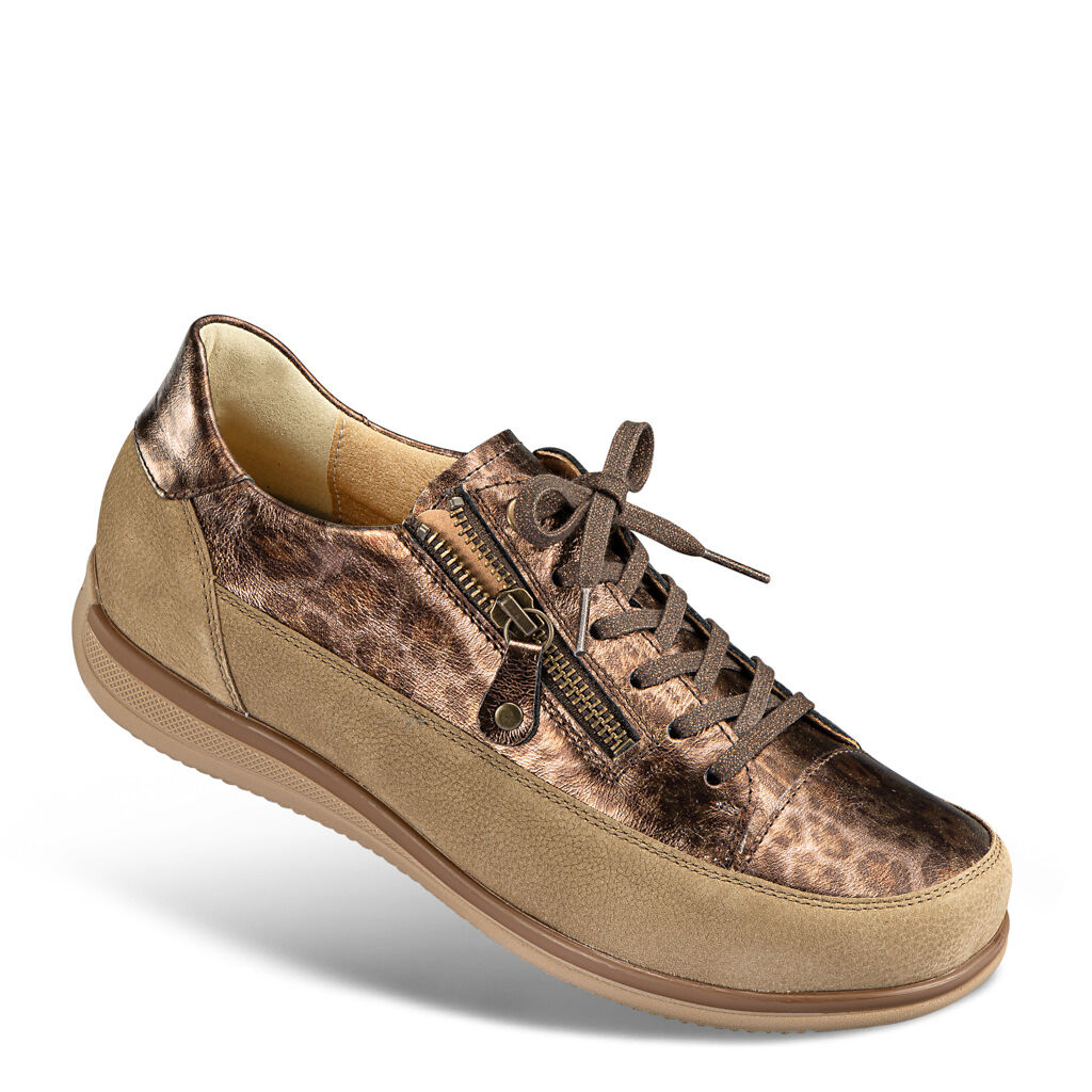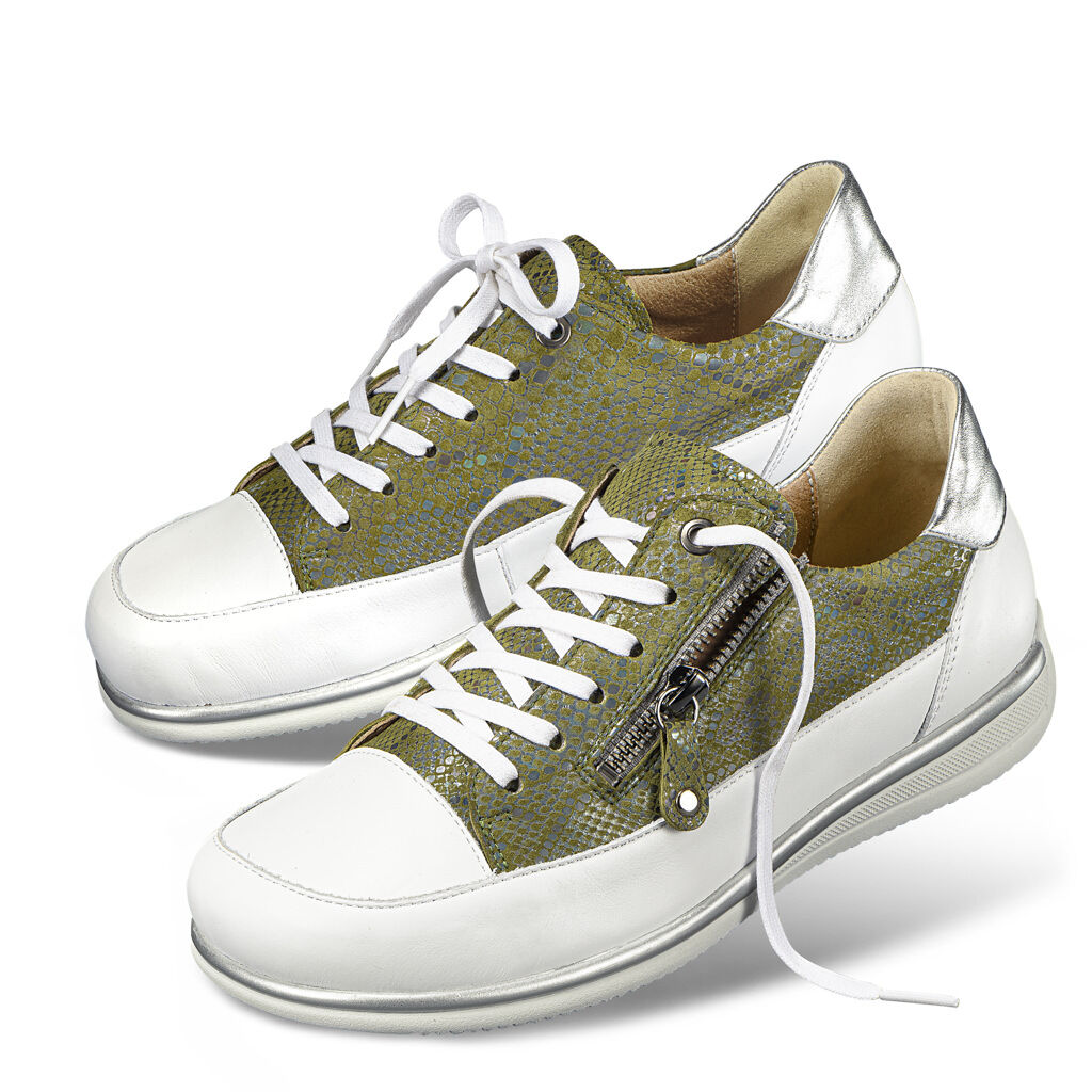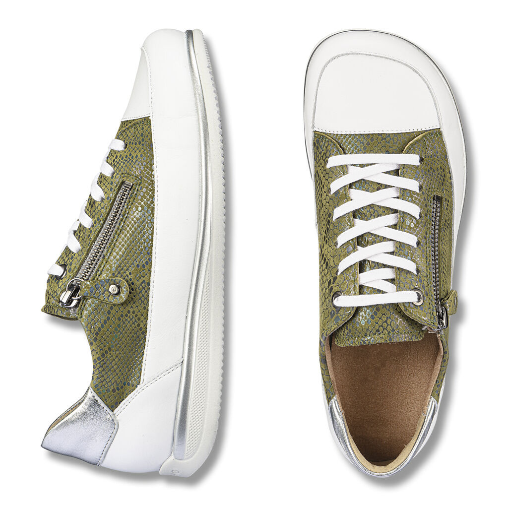 Natürliche Fortbewegung auch in der Stadt: Hochwertiges Leder mit betont hohem Nappalederrand und weichen Polstern, innen Mikrofaser als Futter und Decksohle, extra atmungsaktiv und nachhaltig auf Maisfaser-Basis. Perfekter Sitz durch die Derby-Schnürung, dazu ein praktischer Reißverschluss zum einfachen Reinschlüpfen. Klassik-Sneaker-Sohle mit griffigem Rillenprofil, auswechselbares Leichtkork-Fußbett mit sanfter Polsterung.