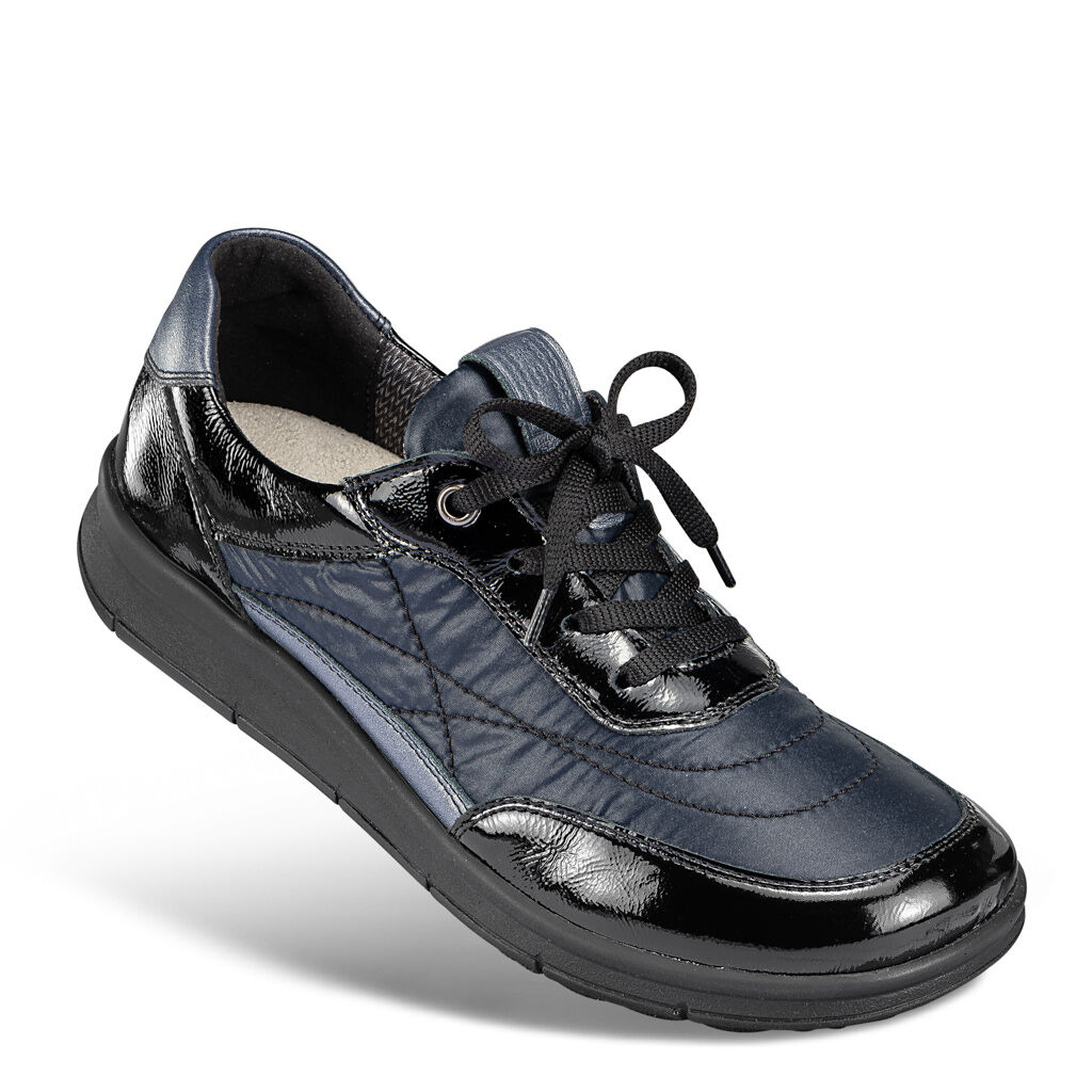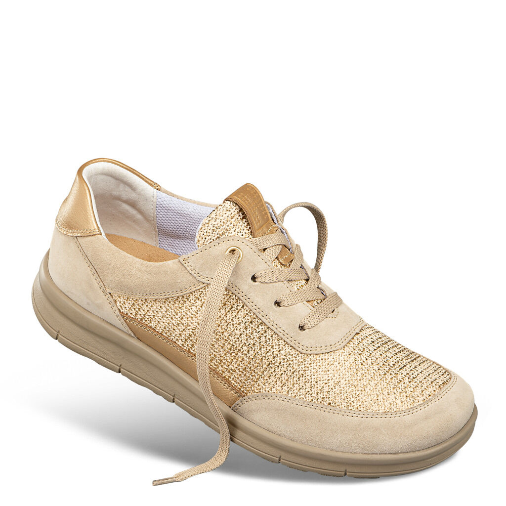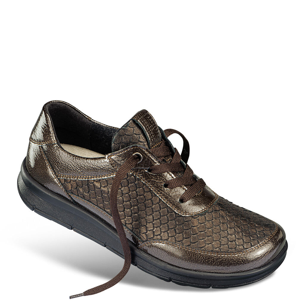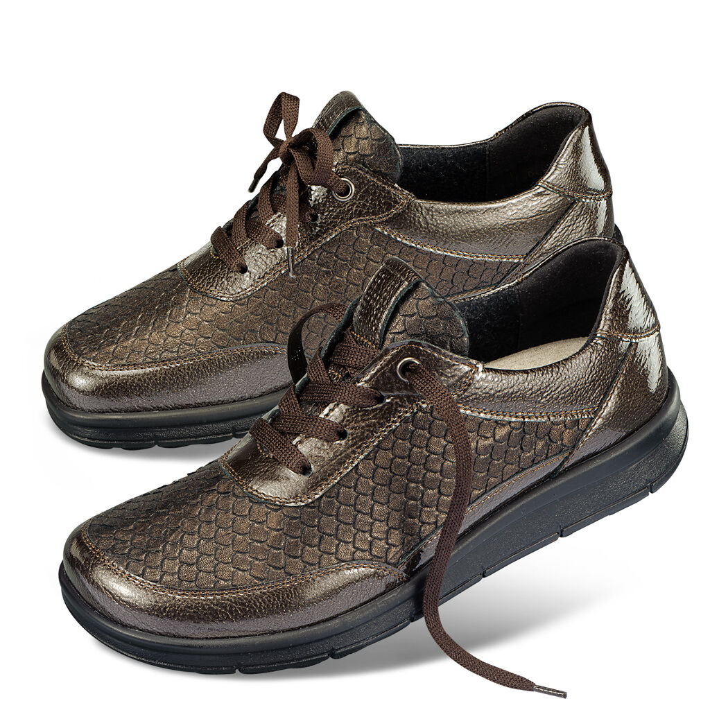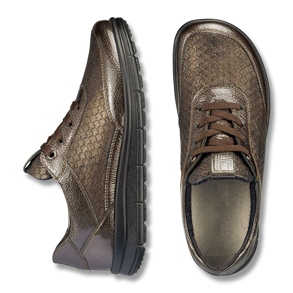 Innovatives Sneaker-Design mit modischer Raffinesse: Die edle Kombination aus schimmerndem Metallic-Leder und hochwertiger Reptilprägung macht das Modell zum absoluten Blickfang. Die aufwändig gearbeitete Stanzung der Schuppen ist ein bewusst gewähltes Designelement, das dem Sneaker seine exklusive Optik verleiht. Mit weich gepolstertem Schaft und Walklodenfutter auf der dämpfenden Leicht-Flex-Sohle mit auswechselbarem Fußbett.