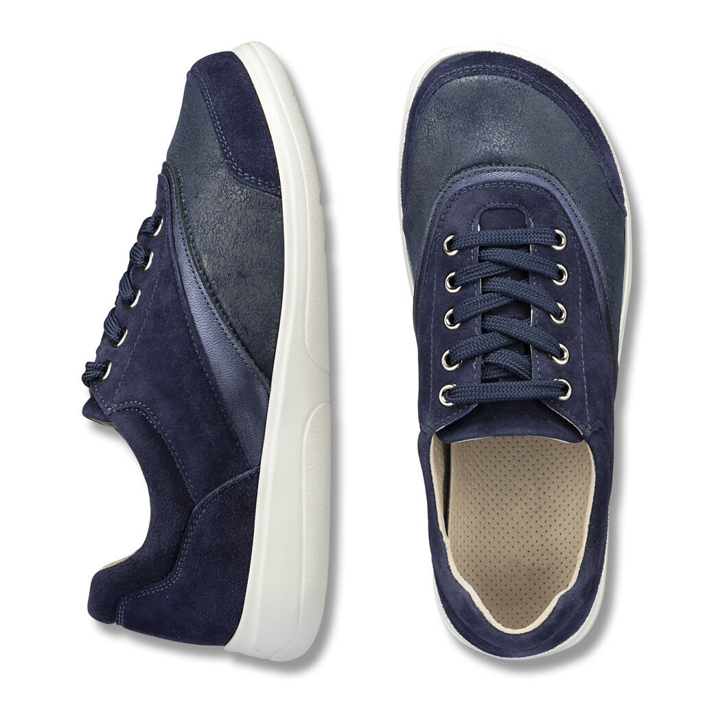 Luxuriöser, extrabreiter Sneaker aus Ziegenleder mit bequemem, druckmindernden Stretcheinsatz über den Zehen. An Schaftrand und Zunge weich gepolstert, innen barfußfreundliche Mikrofaser und Textil. Entlastende Sensitiv-Sohle mit austauschbarem Fußbett und zusätzlicher Unterlage als Weitenausgleich.