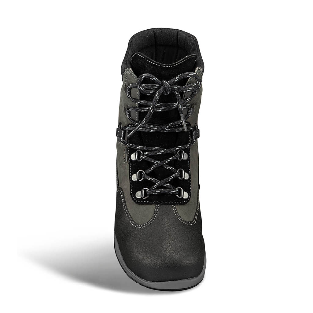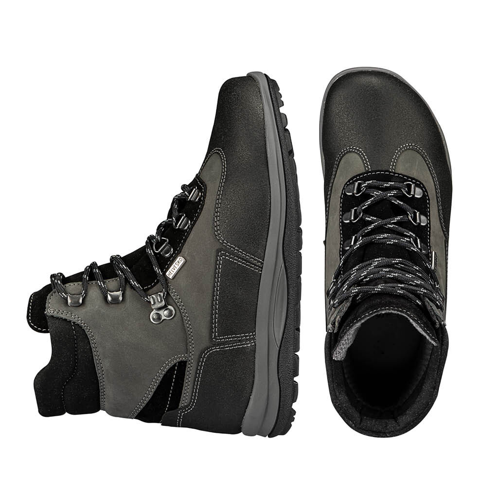Aus Wasser abweisendem Nubuk- und Veloursleder. Ferse und Zehen sind schützend verstärkt. Mit Hakenschnürung und hoher Zunge als Staubschutz. Schaft und Zunge sind weich gepolstert, das Textilfutter ist atmungsaktiv. Auswechselbares Fußbett aus Leichtkork mit Mikrofaserbezug.