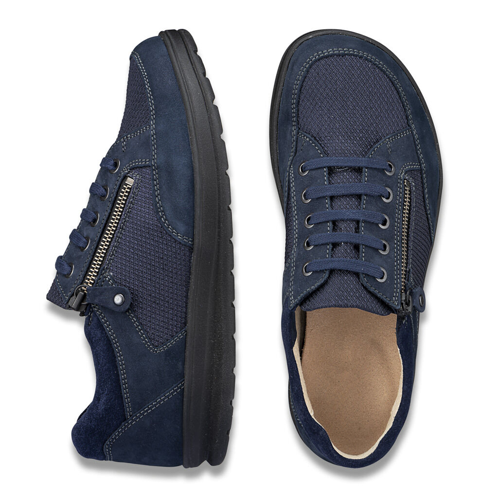 In natürlicher Barfußform und weit zu öffnen für einen einfachen Einstieg dank der Derby-Schnürung und dem praktischem Reißverschluss. Weiches Ökoleder mit hautfreundlichem Lederfutter, am Rand sanft gepolstert und flexibel verarbeitet. Überraschend leichte Future-Sohle mit einem gegen eigene Einlagen austauschbarem Lederfußbett.