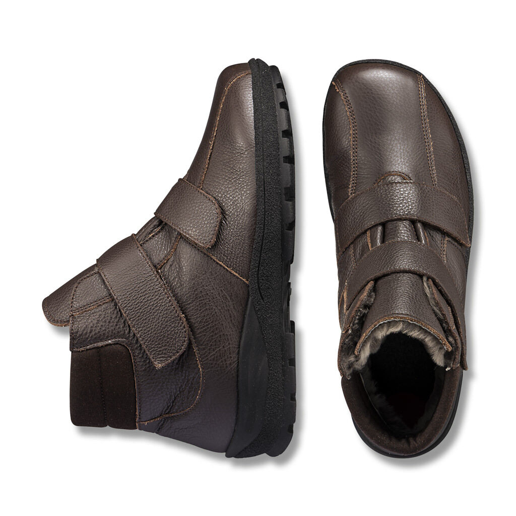 Überraschend leicht, aber warm und höchst wintertauglich. Hochwertiges Leder mit natürlich, klimaregulierendem Lammfellfutter. Sanfter Halt durch den Doppel-Klettverschluss. Lodenbezogenes, austauschbares Fußbett. Robuste FitProfil-Sohle, griffig wie ein Winterreifen.