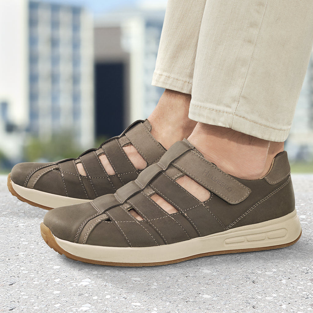 Beweglich und elastisch am Fuß! Schöne Qualität aus Fettnubukleder mit Klettverschluss am Rist und Futter aus Mikrofaser, am Einschlupf rundum abgepolstert. Herausnehmbares Fußbett und Soft-Move-Sohle, mit einer rückfedernden Dämpfungsschichtb und rutschfestem Profil.