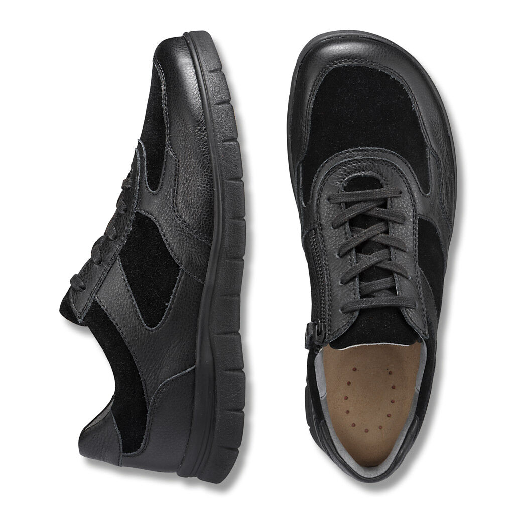 Ein Schnürer zum Genießen, im sportlichen Kontrast von Nappa- und Veloursleder, ledergefüttert und gepolstert, mit sanftem Fersenhalt. Das Kork-Fußbett ist austauschbar. Die stoßdämpfende Infinity-Sohle ist rutschmindernd.