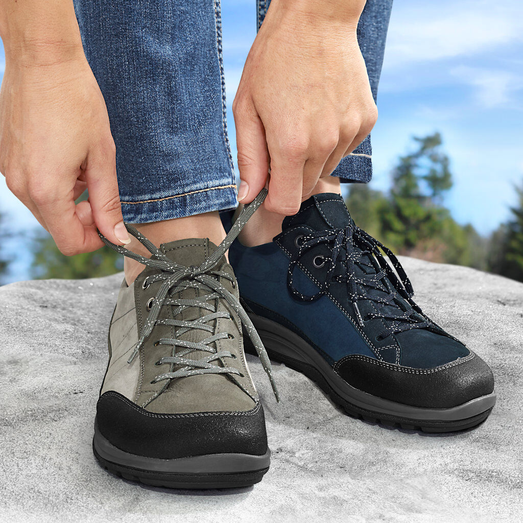 Wichtig ist, dass der Fuß in der Ferse und am Rist guten Halt hat, jedoch für die Zehen viel Platz vorhanden ist. Beim Anziehen drücken Sie Ihren Fuß fest in die Ferse zurück und schließen die Schnürung, das Klettband oder den Reißverschluss. Dann haben Sie einen sicheren Halt in Ferse und Rist. Somit haben Ihre Zehen genügend Platz zum Spreizen und Abrollen.