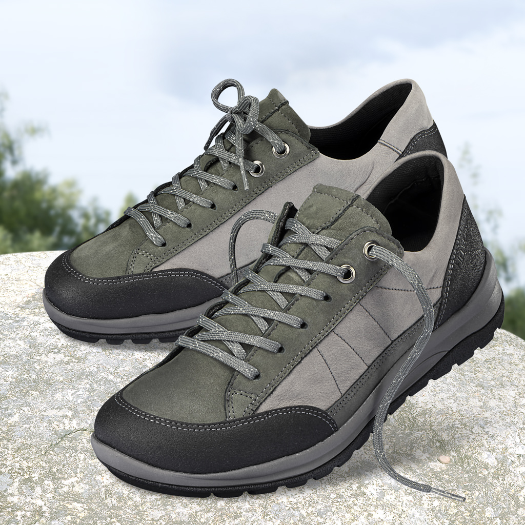 Maßgeschneidert sitzender Sneaker, wetterfest aus ölgegerbtem Rindleder mit Schutzkappen. Das atmungsaktive Öko- Leder, bleibt dank natürlicher Gerbfette schön griffig und weist Nässe zuverlässig ab. Innenausstattung aus feuchtigkeitsregulierender Mikrofaser. Robuste, rutschhemmende Adventure- Sohle mit einem auswechselbaren Fußbett.