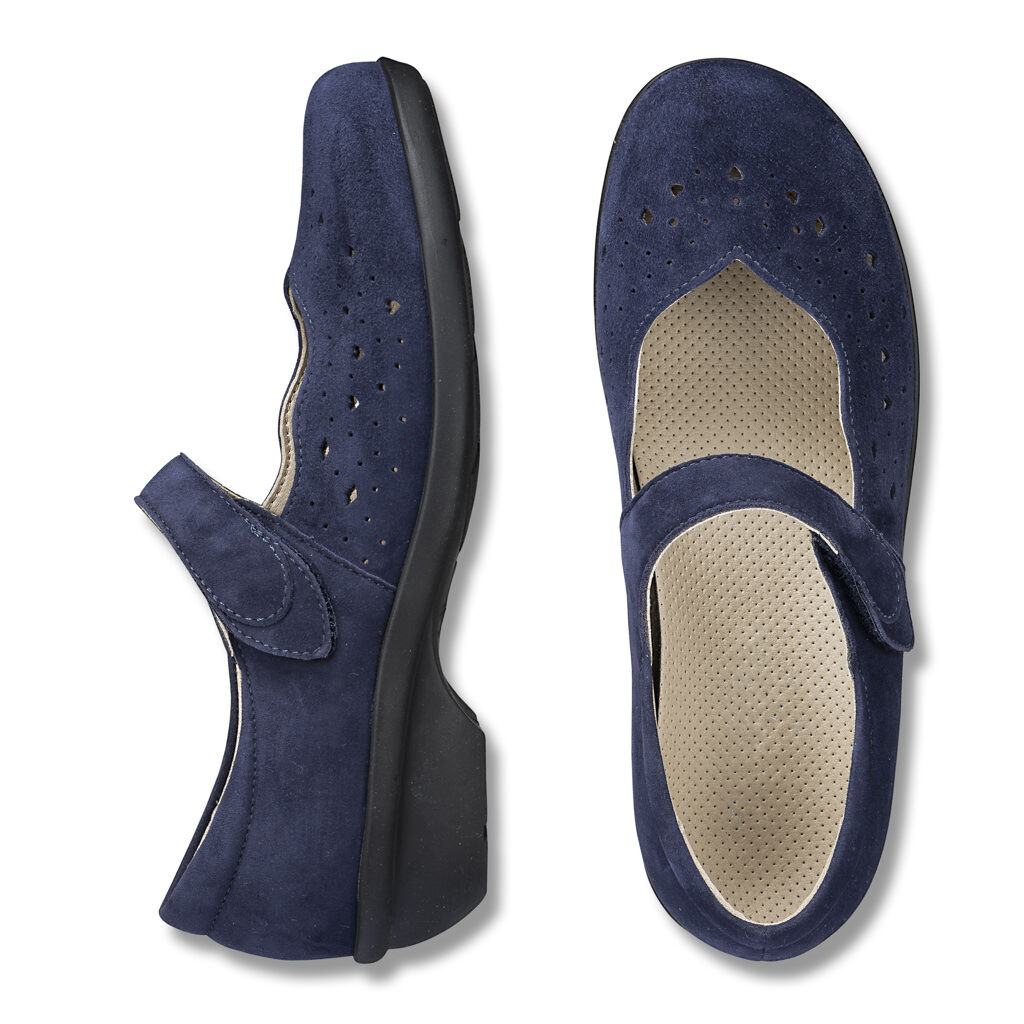 Mit dem hübschen Stanzmuster und dem femininen Absatz eine perfekte Partnerin zu Sommerkleidern! Verspielte Ballerina aus samtigem Veloursleder, flexibel verarbeitet, gefüttert mit hautfreundlicher Mikrofaser. Herausnehmbares, weich gepolstertes Fußbett mit Lederbezug, abriebfeste, flexible Absatz-Sohle.
