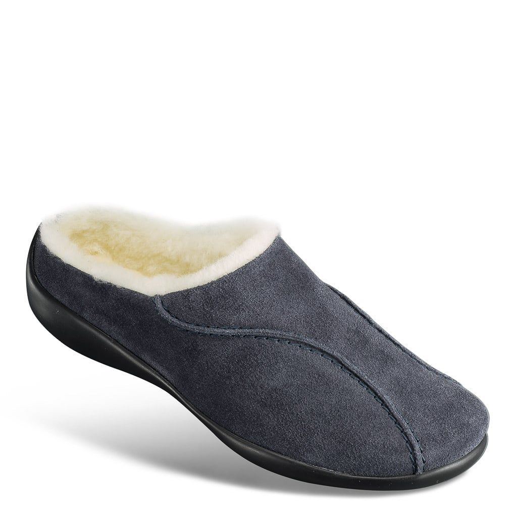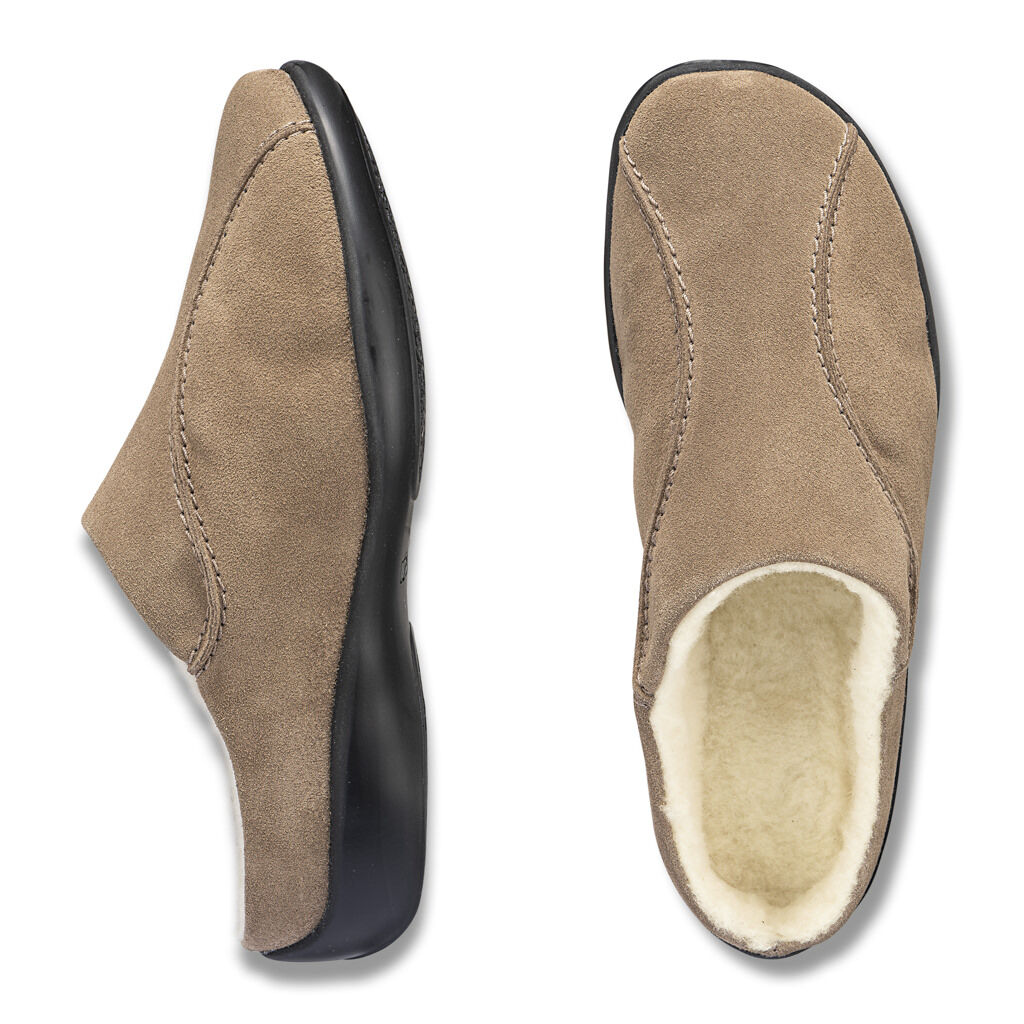 Femininer Hausschuh aus samtweichem Veloursleder, schlank in der Optik durch schwungvolle Ziernähte. Innen komplett warm und weich gefüttert mit kuscheliger Lamm-Schurwolle, auch als Decksohle: für atmende Wärme ohne Schwitzen. Durch Verarbeitung mit einer Strobel-Naht wird der Schuh angenehm flexibel, die formschöne Sohle ist in alle Richtungen biegsam.